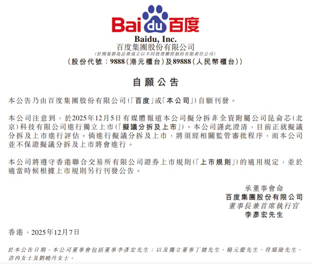 百度集团12月7日在港交所发布公告称,有媒体报道公司拟分拆非全资附属公司昆仑芯(北京)科技有限公司进行独立上市。公司谨此澄清,目前正就拟议分拆及上市进行评估。倘进行拟议分拆及上市,将须经相关监管审批程序,而公司并不保证拟议分拆及上市将会进行。
