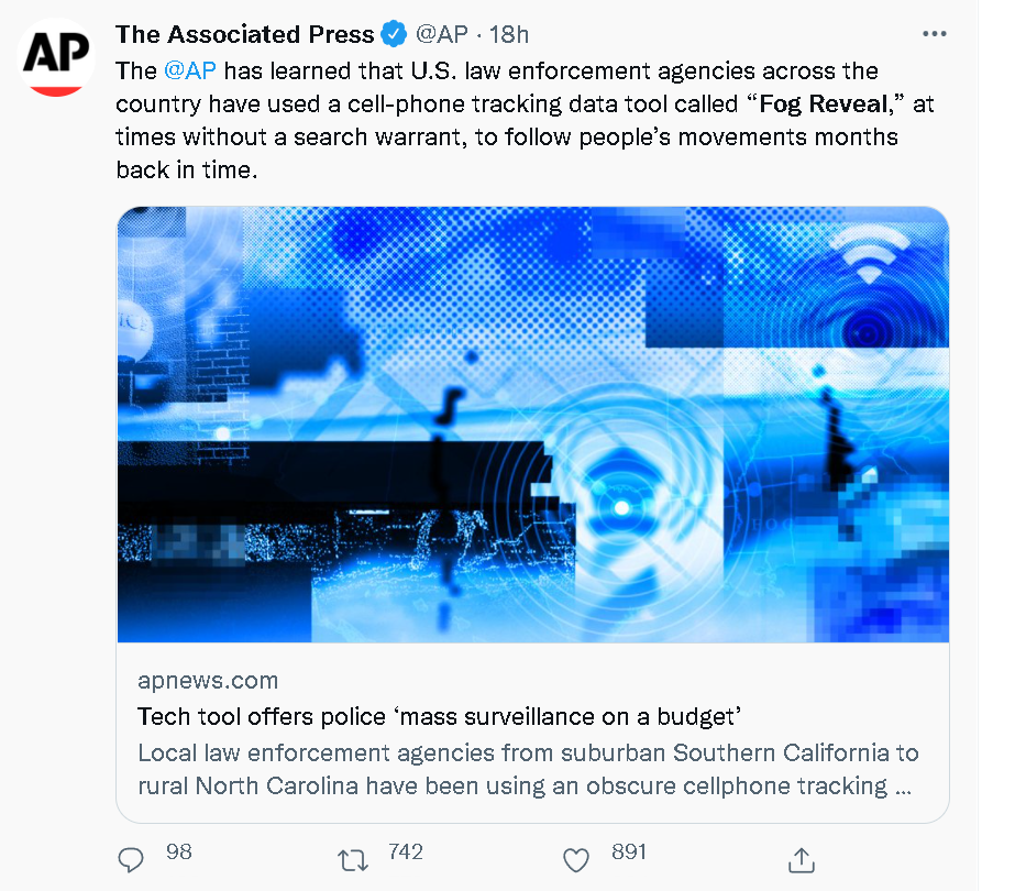 根据美联社的报道,这款正在被美国多个地方的警察局使用的手机用户信息追踪软件叫“Fog Reveal”,直译成中文叫“迷雾揭示”。