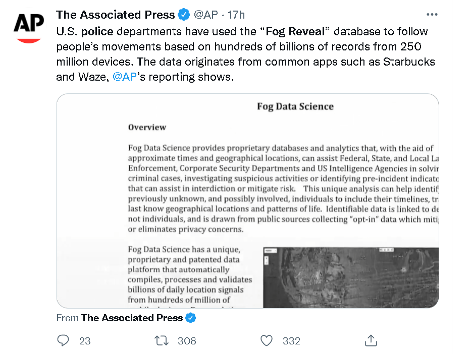 不仅如此,美联社还通过采访发现,不少手机APP提供方也并不清楚其内置的数据追踪功能生成的信息,已被“迷雾揭示”给警方用来办案(或监控他人)的情况。星巴克在回应美联社询问时还明确表示,该公司没有授权“迷雾揭示”这么使用其APP生成的数据。