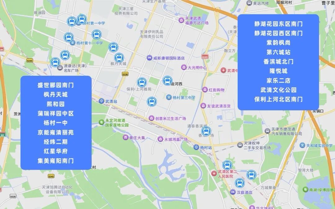 静湖花园东区南门、静湖花园西区南门、紫韵枫尚、第六城站、香滨城北门、隆悦城、家乐二店、武清文化公园、保利上河北区南门、盛世郦园南门、枫丹天城、熙和园、蒲瑞祥园中区、杨村一中、京能雍清丽苑、经纬二期、红星华府、集美雍阳南门