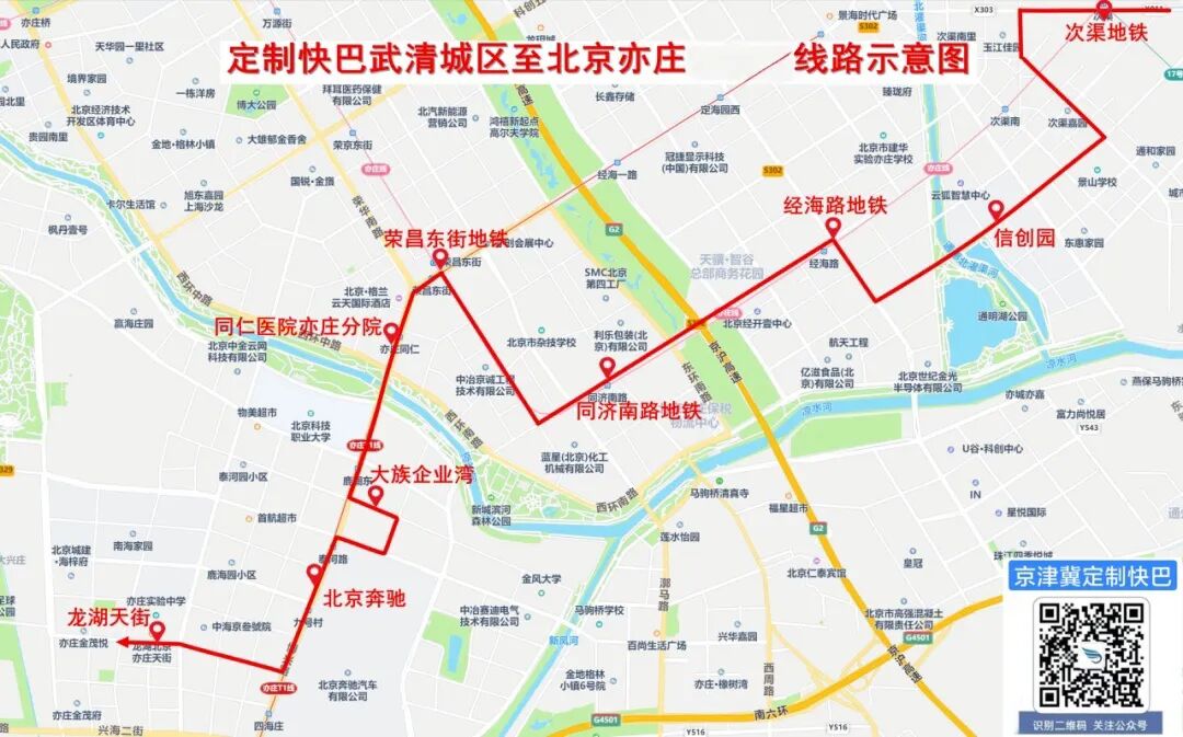 4月13日(周一),武清至北京亦庄定制快巴正式开启试运行!4月10日(周五)15:00全面开启预售,同步上线专属固定班次,覆盖武清18个核心站点与北京亦庄9大交通核心、医疗/产业园区,一站接驳多条地铁线,告别辗转换乘、省去自驾奔波,让京津出行省心、省时、更舒适!