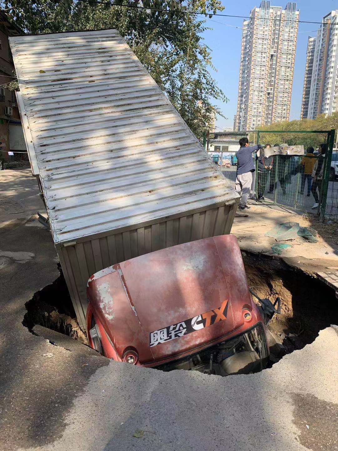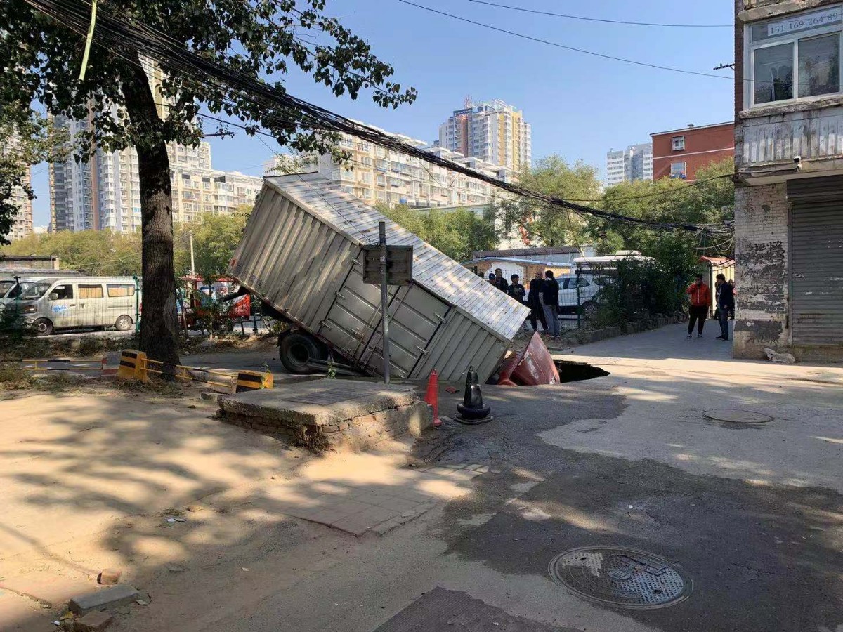 今晨(10月30日)6时许,朝阳区八里庄东里小区9号院地面突发塌陷事故,导致一辆厢式货车车头陷入地下。