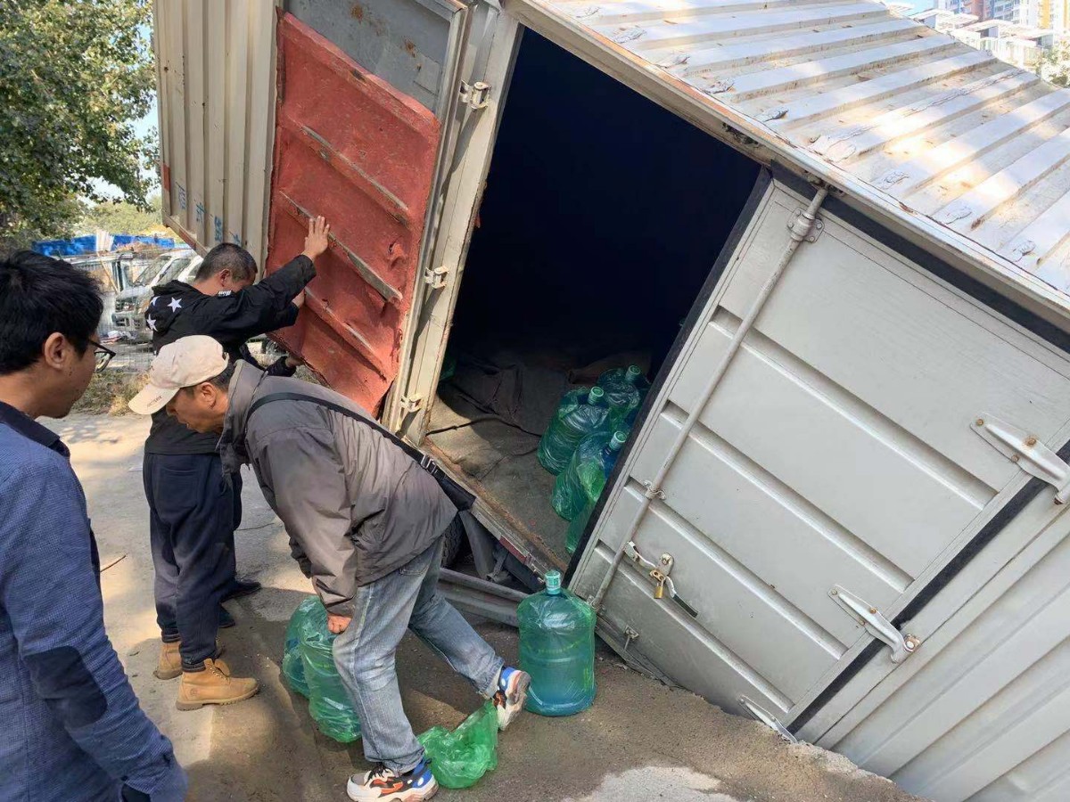 中午12时30分,吊车已经到达现场,厢式货车中的桶装水也已经全部清空,正准备吊起货车。