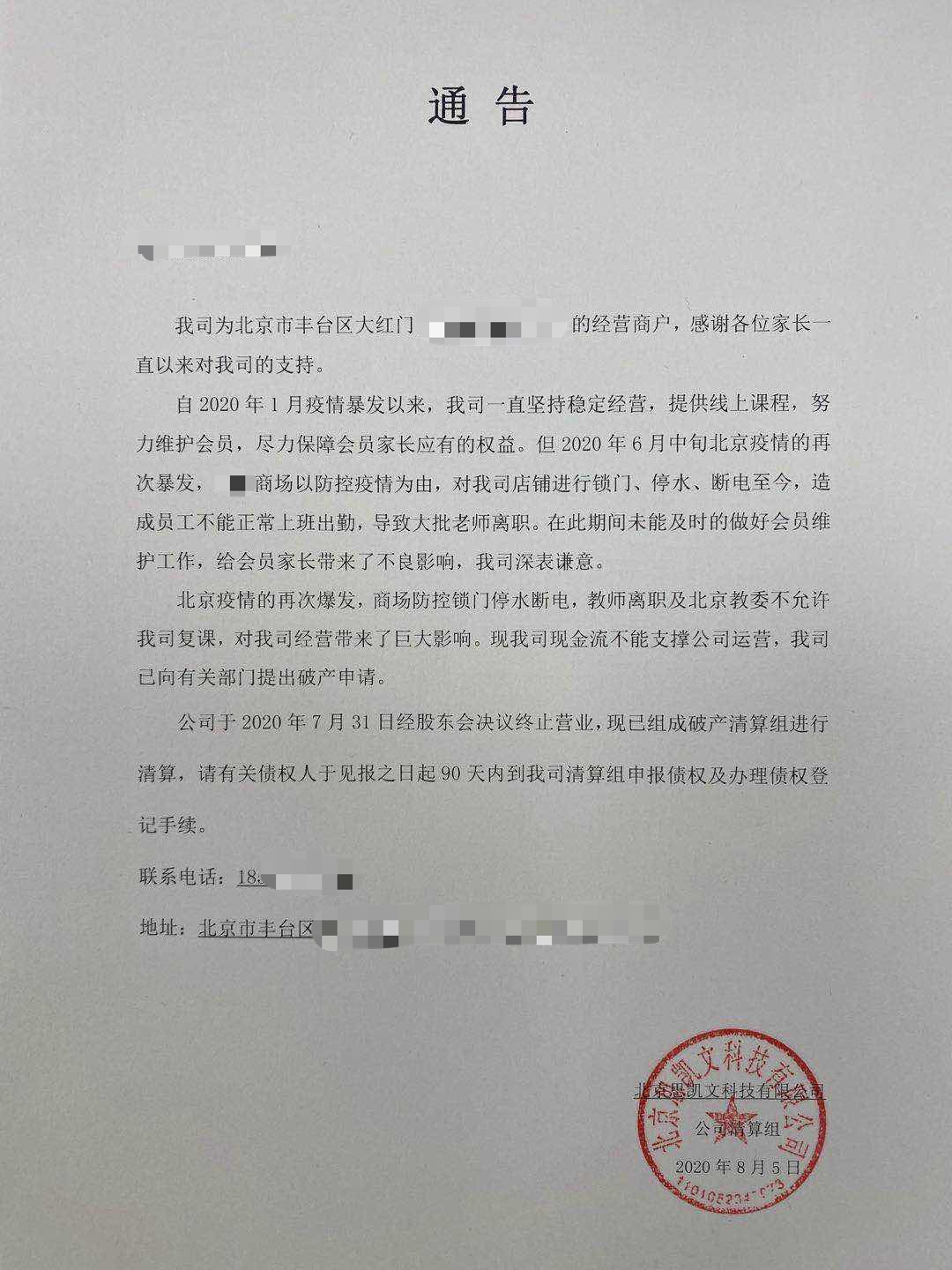 去年,彭女士花了2万多元,在丰台区大红门一家商场3层的巧虎KIDS早教中心,给孩子买了144节幼教课,才上了40节就停了。“年初因为疫情,线下课程转到了线上,后来连线上课程也停了。7月29日还说正在消毒马上复课,8月10日就发布了一则破产通告。”彭女士向记者展示的通告显示,因多种原因导致现金流无法支撑运营,公司已提出破产申请,请有关债权人在90天内到公司清算组申报债权及办理债权登记手续。