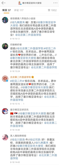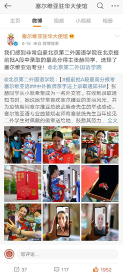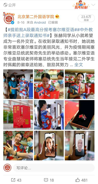 今年暑假,北京女孩儿张赫收获了重重惊喜,她是北京第二外国语学院在京本科提前批普通类A段录取的最高分,被录取至塞尔维亚语专业,还收到未来老师亲手送达的全校首封录取通知书。这一消息经二外官微报道后在网上刷屏,连塞尔维亚驻华大使馆也隔空“点赞”。记者了解到,张赫即将就读的塞尔维亚语专业是二外的传统外语专业,于2015年复建,目前发展态势良好,截至今年7月,该专业已有18人次赴塞尔维亚留学。