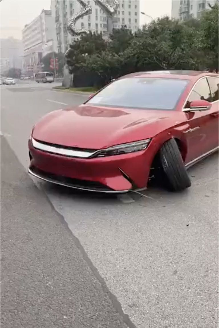 事故现场的一段视频显示,一辆红色比亚迪汉EV车横在路上,左前轮一半脱出车体,左后轮胎爆胎。现场没有其他碰撞痕迹,只有左前轮后有一条明显的拖痕。车辆气囊未见打开,也没有明显的零件散落。据一位现场目击者称,这辆汉EV在万丰路由北向南行驶,在西局南街路口调头后,由于突然加速,撞到了隔离带上。也有知情人士透露,当时驾驶员是错把油门当成了刹车,才造成了这起事故。