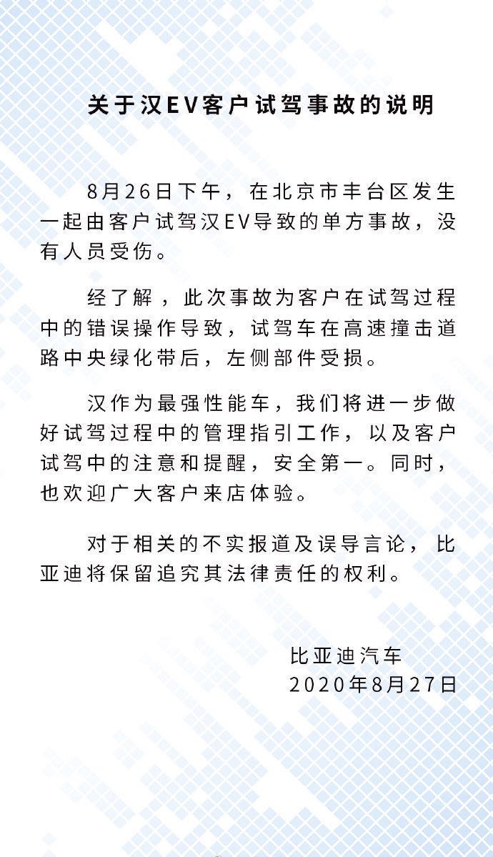 昨天上午,比亚迪汽车在其官方微博针对此次汉EV客户试驾事故发布了一则说明:“8月26日,在北京市丰台区发生一起由客户试驾汉EV导致的单方事故,没有人员受伤。经了解,此次事故为客户在试驾过程中的错误操作导致,试驾车在高速撞击道路中央绿化带后,左侧部件受损。汉作为最强性能车,我们将进一步做好试驾过程中的管理指引工作,以及客户试驾中的注意和提醒,安全第一。”