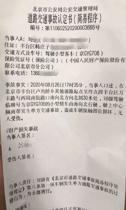 根据《道路交通事故认定书》显示,8月26日17时35分,当事人口述,在丰台区万丰路与西局南街路口南向北方向北侧30米处,刘某驾驶临牌号为京G*****的小型轿车由南向北行驶,驶上中心隔离带发生单方交通事故,造成车辆接触部位损坏,无人受伤。