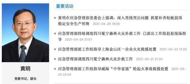 2020年3月,应急管理部“党组”改为“党委”,黄明任应急管理部党委书记、副部长。