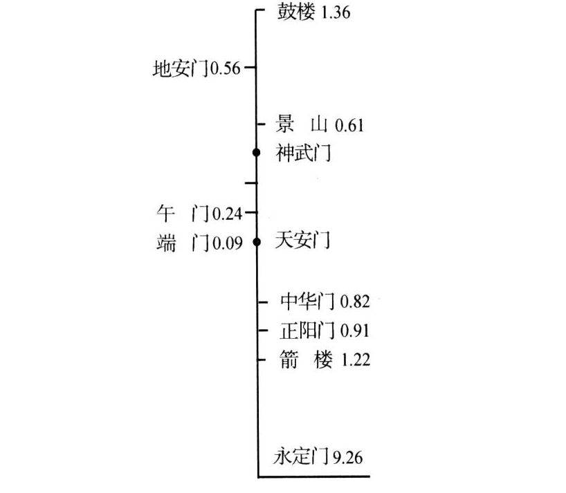 1952年5月,为了解北京旧城中轴线的实际情况,北京市房管局测量队对旧城中轴线进行了实测,在中轴线上选取了几个重要节点作为实测点:永定门北侧的门中心,箭楼、正阳门、中华门、天安门、端门、午门各门南侧的门中心,神武门北侧的门中心,景山万春亭南侧中心,地安门和鼓楼南侧的门中心。