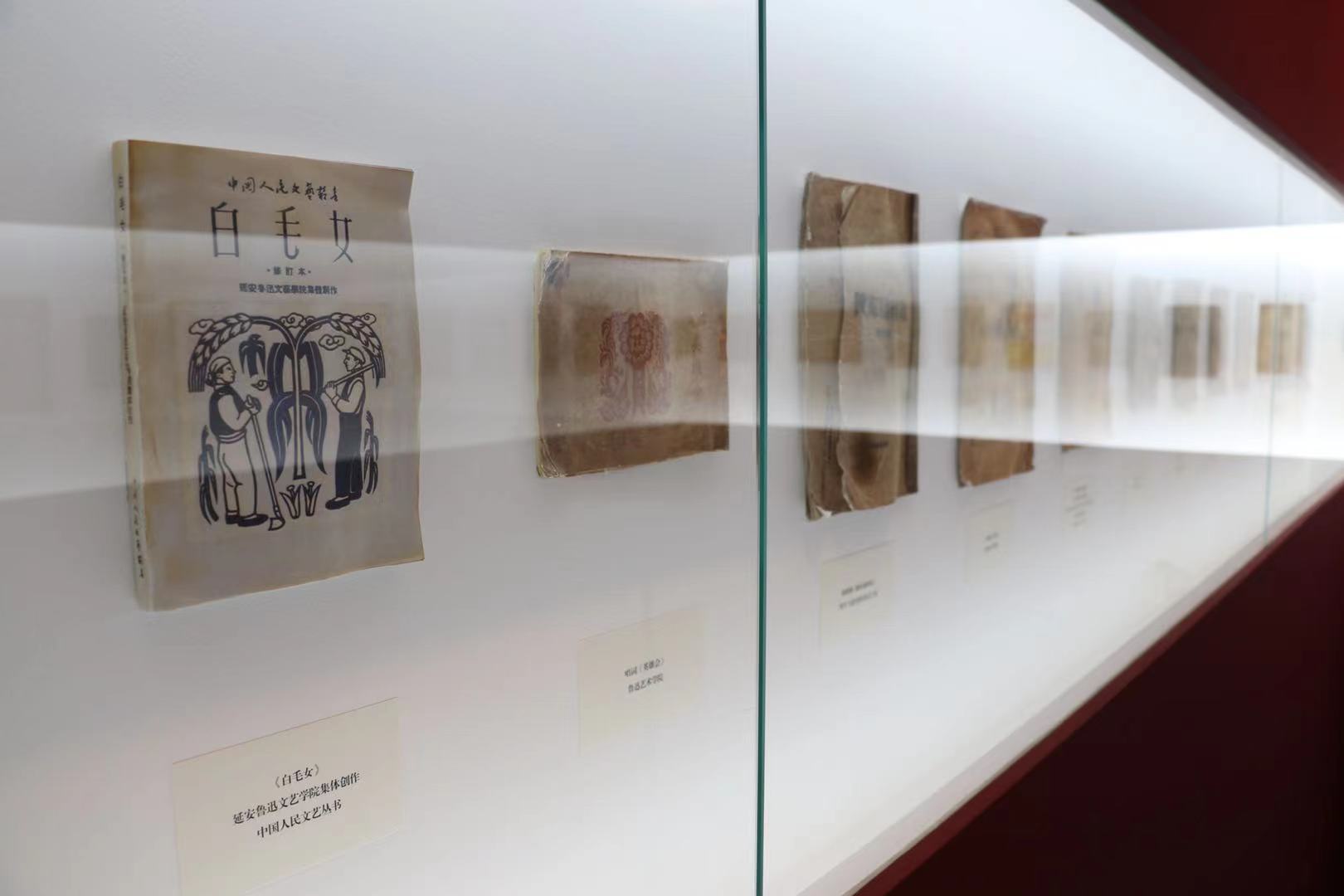 在展厅内,通过一本本泛黄的丛书实物和黑白的影像,观众可以重温那段光辉的革命历史——由延安鲁艺集体创作的《白毛女》《英雄会》唱词,北方大学时期推出的《一杆红旗》等均在此次展览中亮相。展览还展出了毛泽东题写的“国立戏剧学院”,华北联合大学文艺学院毕业证书等珍贵展品。