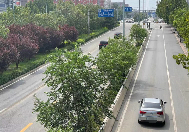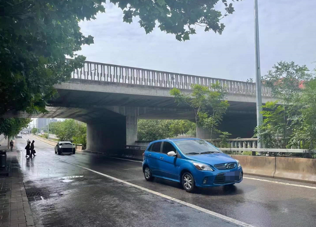 “中间主路的地势更低。”家住铁路桥附近的市民张先生将记者带到主路和辅路分隔的绿化带旁,示意记者仔细观察绿化带上的栏杆。“你看那栏杆上,有一条明显的积水痕迹,底下粘着淤泥、树枝、树叶的,昨天淹水就淹到那儿,站在辅路地势高的地方看,得有1米多深。但是主路地势更低,昨天晚上雨大积水的时候,主路的水得有两米多深,泡的是小车。两米深的水啊,小车直接就没顶了。”在张先生的指引下,记者发现,栏杆上果然有明显的淹水痕迹。如果站在主路,淹水痕迹足可以超过头顶。