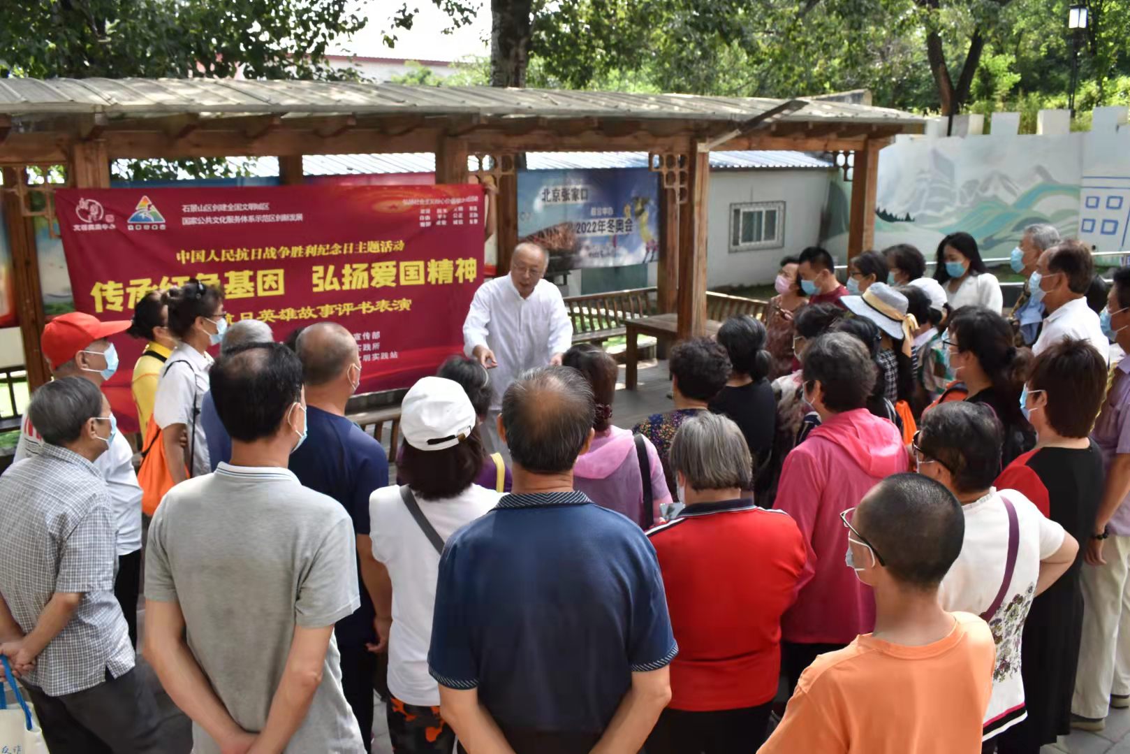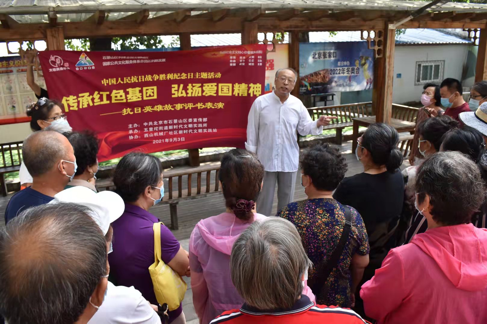 9月3日,石景山区五里坨街道新时代文明实践所组织开展“传承红色基因,弘扬爱国精神”抗日英雄故事评书表演,邀请到中国曲协会员、营口评书协会名誉会长、国家级非遗保护项目“营口评书”传承代表刘振波现场表演抗日英雄故事评书。社区居民40余人参加观看。