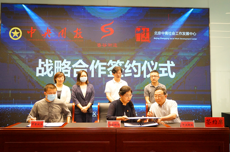 9月6日下午,石景山区鲁谷街道与中央团校党的群众工作教研部、北京中青社会工作发展中心签署三方战略合作协议。接下来,三方将加强社会工作服务中心试点建设,提升社区治理水平,打造一支专业化、职业化的社区社会工作者队伍,积极构建基层治理新格局。