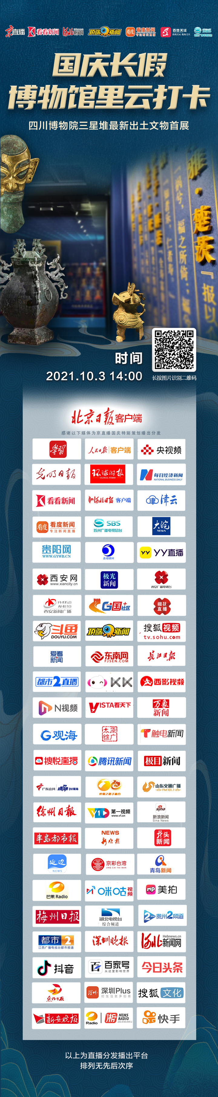 北京日报客户端京直播联动上海看看新闻、河南日报顶端新闻、河北日报河北新闻网、贵州电视台百姓关注、成都电视台看度新闻、苏州电视台推出“国庆假期 博物馆里云打卡”主题联动特别节目,以直播形式播出,国庆七天假期每天推出一场,陪您云游博物馆。10月1日-7日每天14:00开播!让您足不出京,足不出户,在北京日报客户端一屏云游博物馆,来领略历史文化的魅力和新潮流。