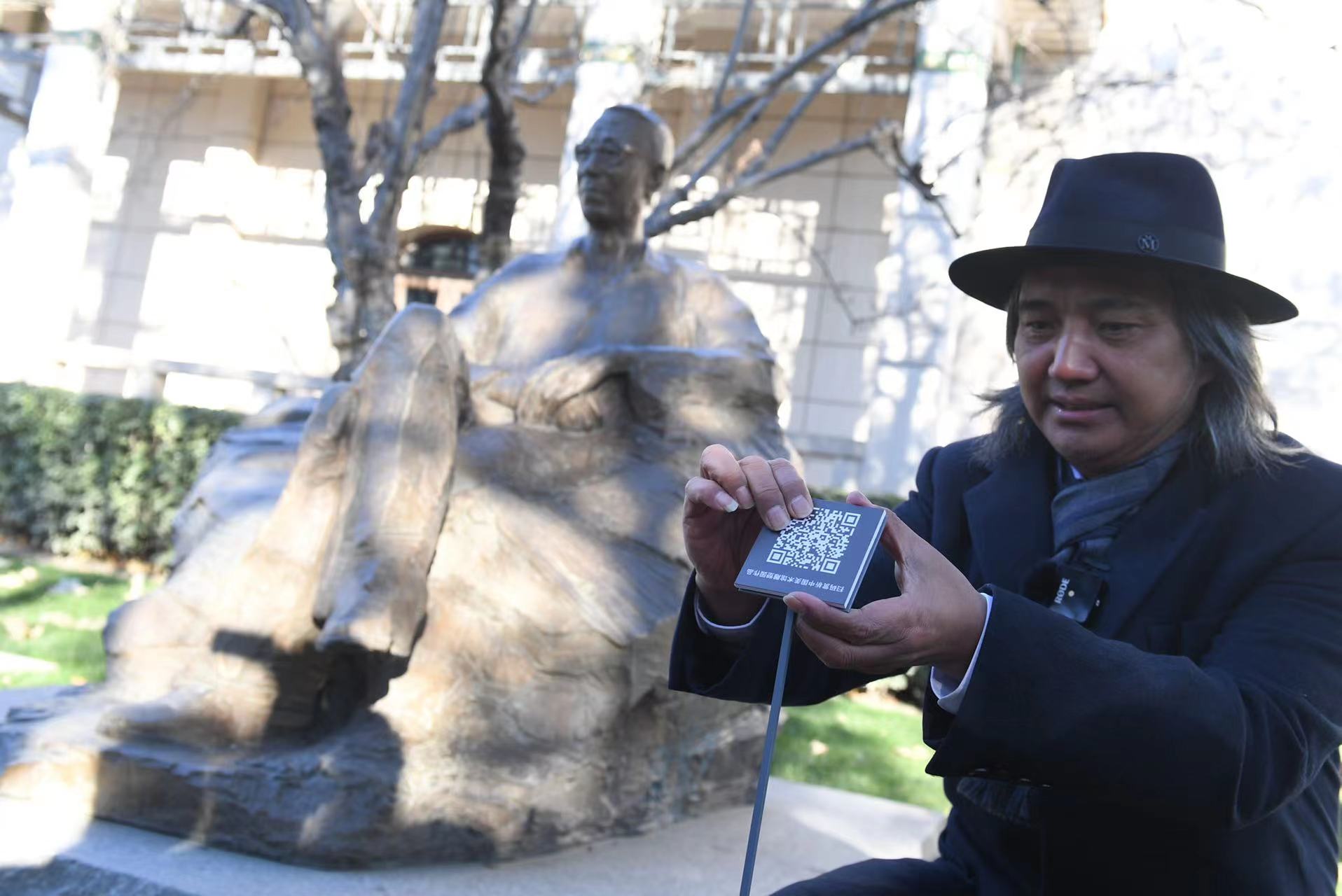 12月24日上午,气温降到了零下七度。中国美术馆馆长吴为山带领馆内党员、专家及青年雕塑家来到户外雕塑园,为雕塑张贴二维码,这也是美术馆推进“我为群众办实事”实践活动的举措之一。