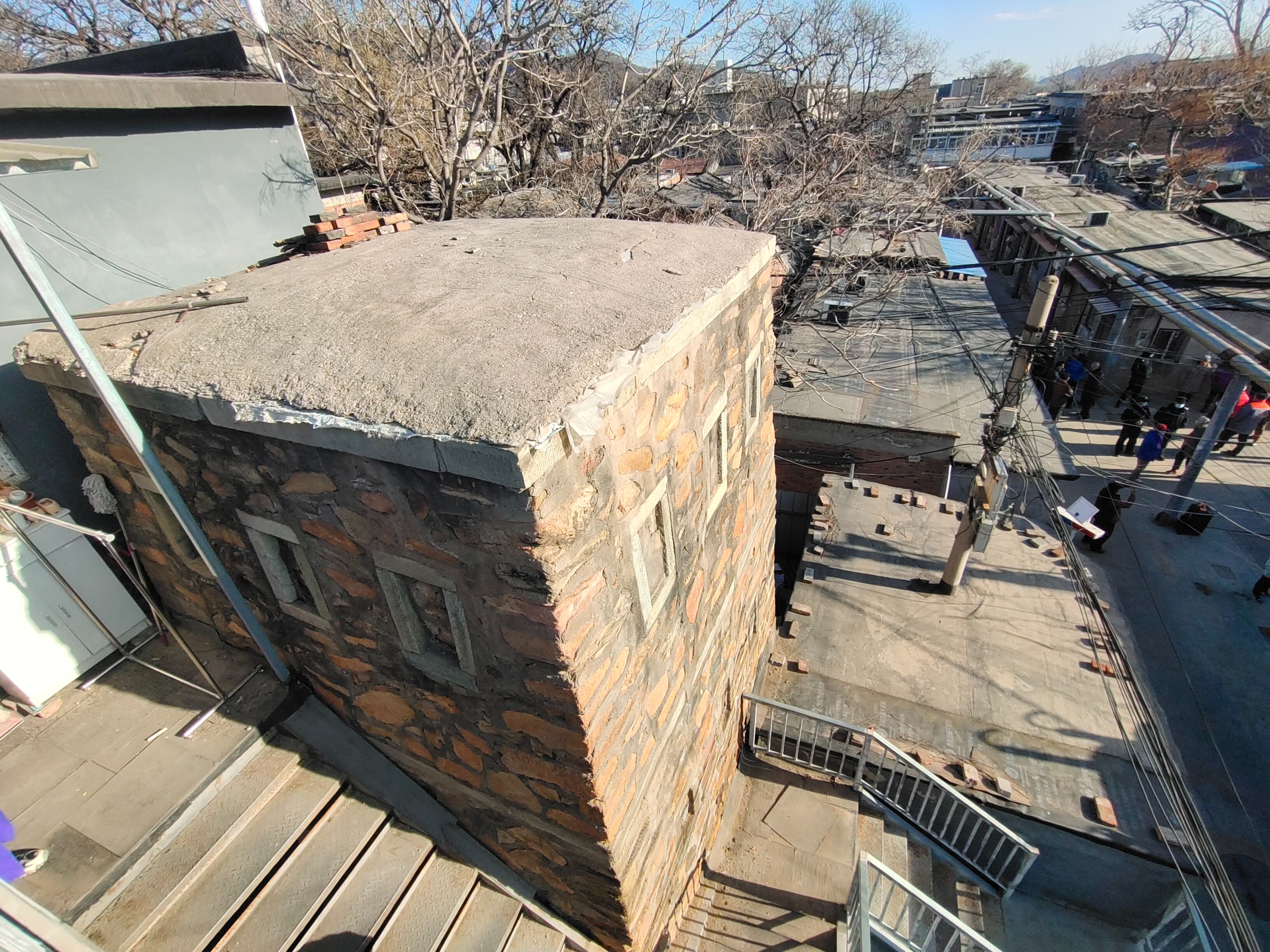 碉楼一点儿也不起眼,西南碉楼楼顶被当地居民自发保护了起来,用塑料布和水泥给盖了个“盖儿”。