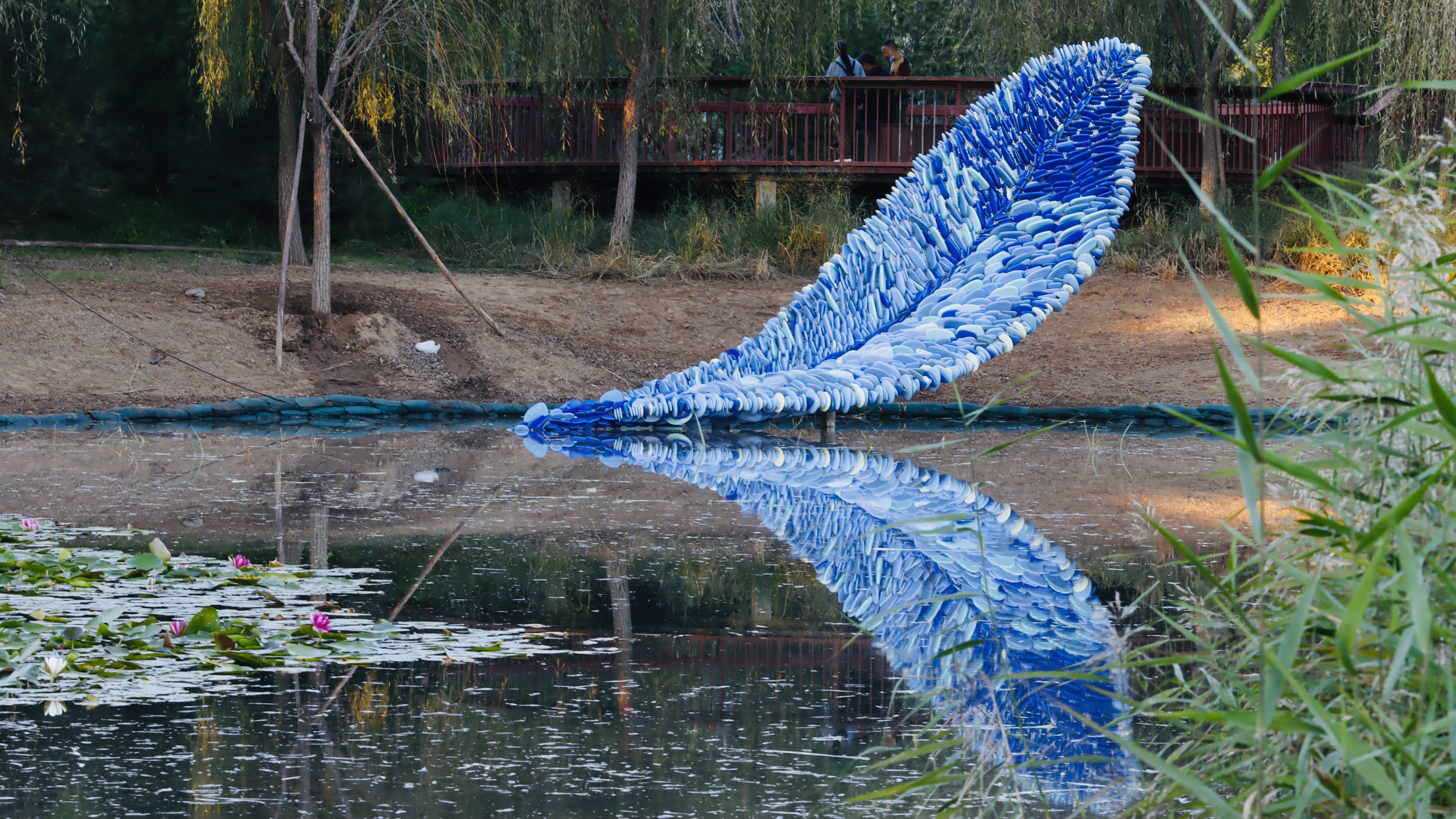 在通州区城市绿心森林公园的水系中,也有一件为冬奥会新创作的公共艺术作品《舟》。它看起来如同一叶代表“同舟共济”的轻舟,也像一根羽毛,一片象征着和平与友谊的橄榄叶。走近仔细看,雕塑由许多鹅卵石般的陶瓷颗粒组成。它由中国艺术研究院雕塑家张冕、郅敏合作,是北京冬奥会公共艺术作品征集活动评选出的最佳作品之一。