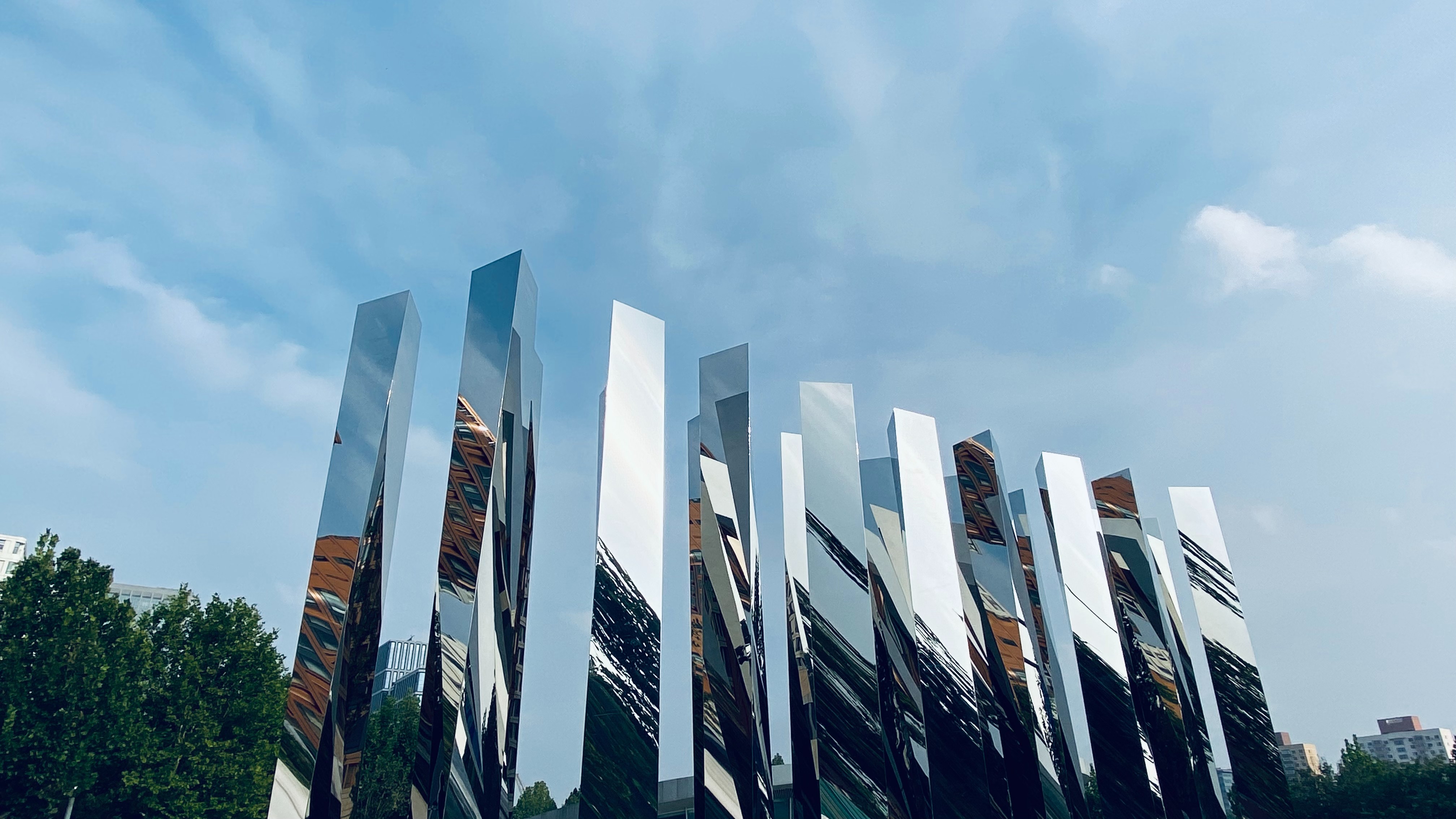 雕塑中包含十多个高逾5米的镜面装置,它们错落地形成阵列式布局,以每分钟转一圈的速度缓慢转动。为了达到最好的视觉效果,邓乐还使用计算机软件进行模拟。“这是一件与环境共融、共振、共鸣的作品,它表达着世界各个国家和地区对体育的热爱,也传达着奥运精神的不朽。”
