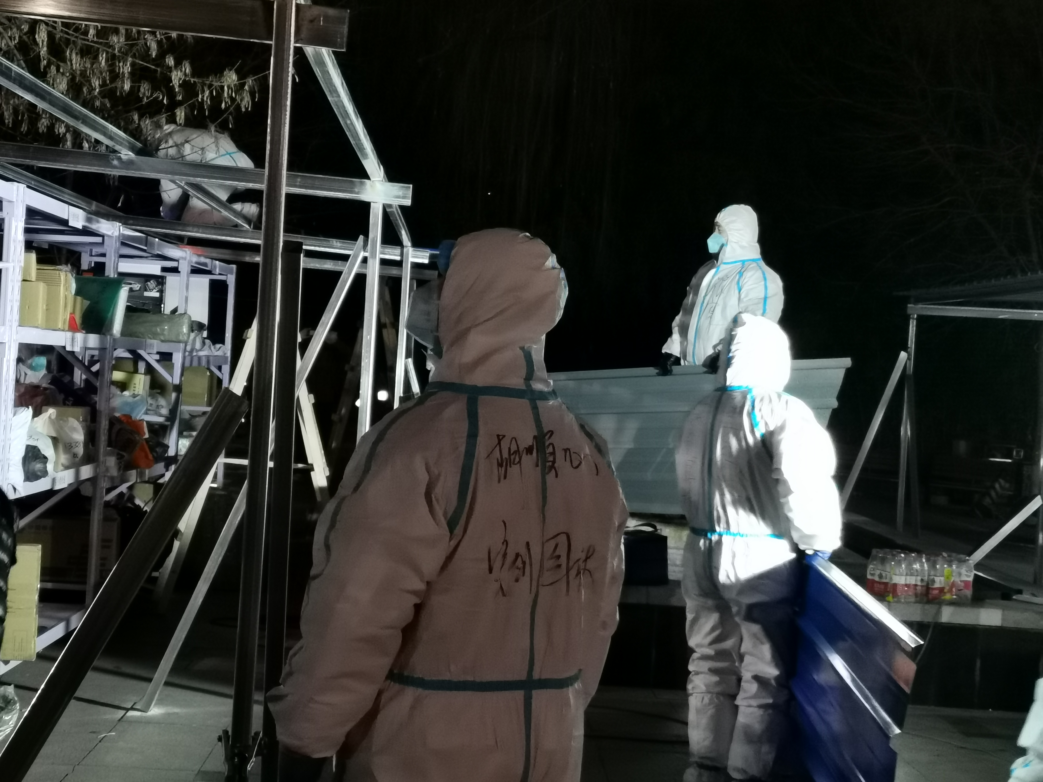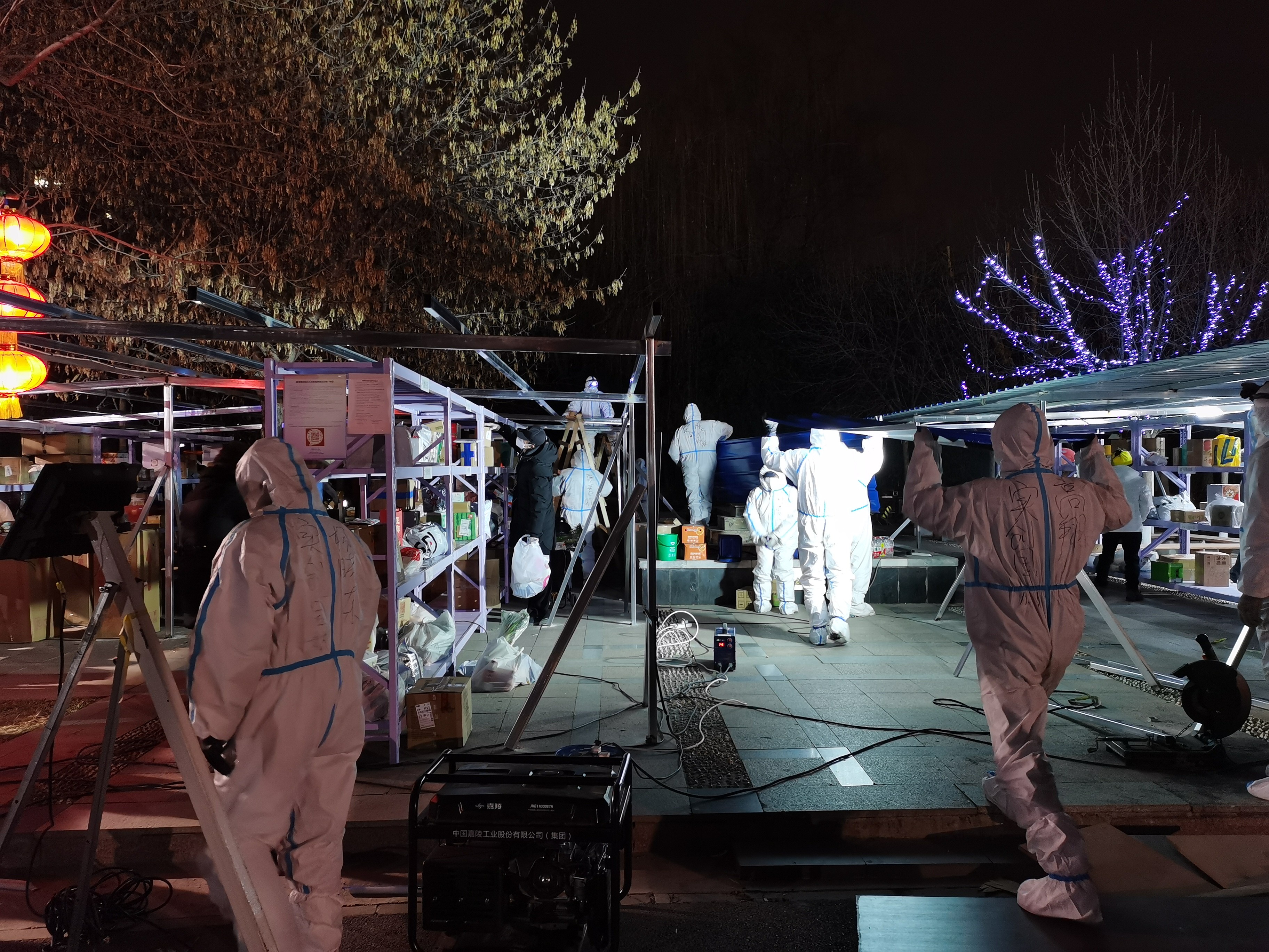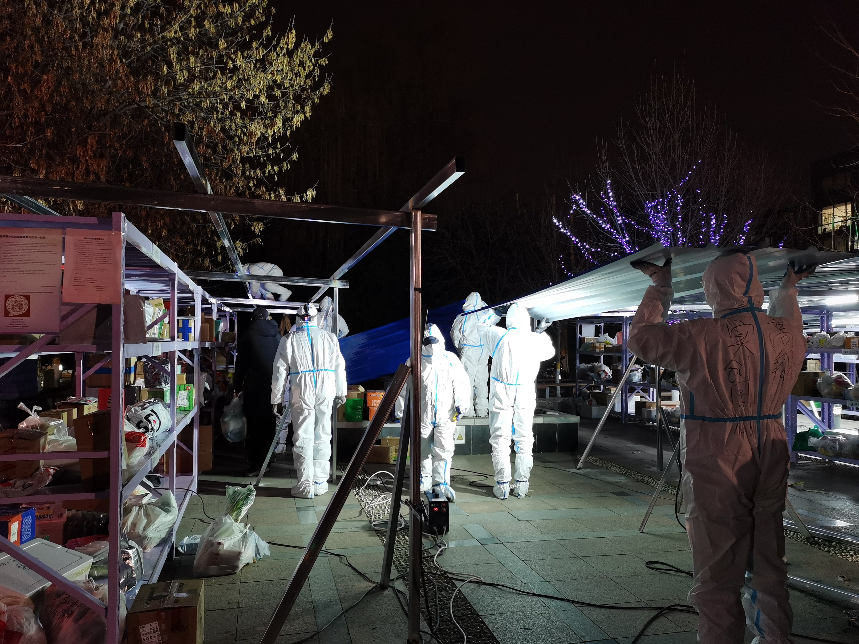 1月19日晚,气温已经降到零下,海淀区上地街道博雅西园小区物业的员工忙碌起来。为了保障居民物资供应,社区和物业给封控区内外的快递、外卖置物货架及运输通道搭建棚子,确保居民快递、外卖存放不受降雪影响。