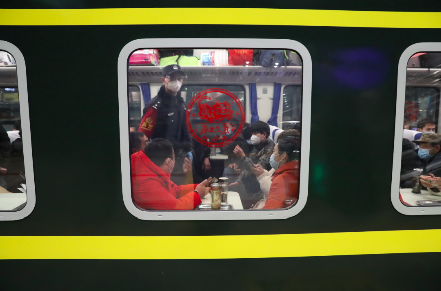 车厢玻璃上贴着红彤彤的窗花,一下子有了年味儿。为了方便旅客及时找民警求助,民警们还在车厢内张贴了报警服务电话。