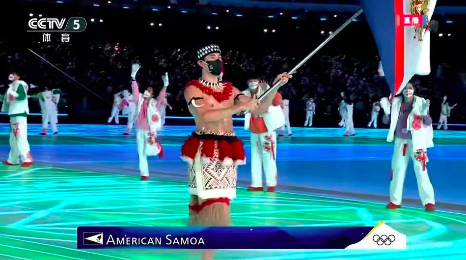 北京冬奥会开幕式上,不惧寒冷、“抹油”亮相的美属萨摩亚代表团旗手