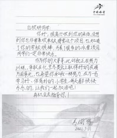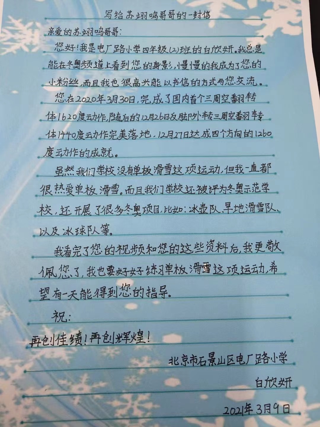 10岁的白欣妍是电厂路小学五年级二班的一名小学生。去年3月,在学校组织的为冬奥运动员写信送祝福的活动中,白欣妍给苏翊鸣大哥哥写了一封热情洋溢的信,表达了对单板滑雪运动的热爱,并祝愿他取得好的成绩。苏翊鸣在回信中鼓励道:“让我们一起加油吧!”