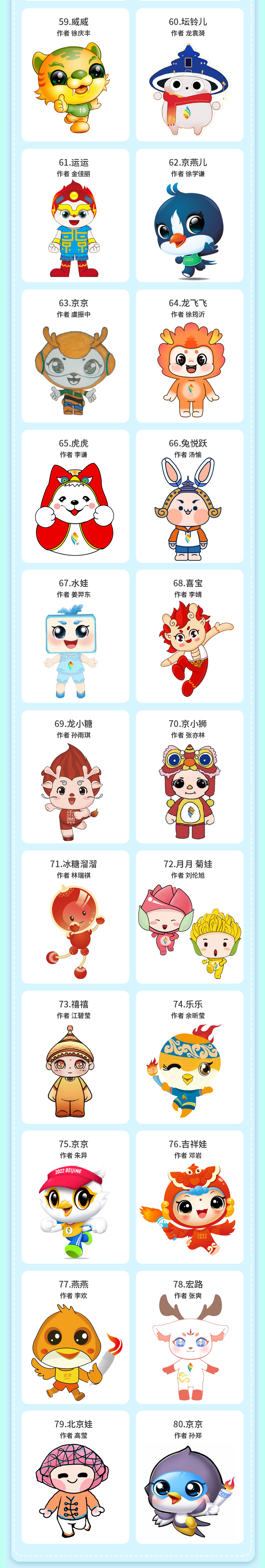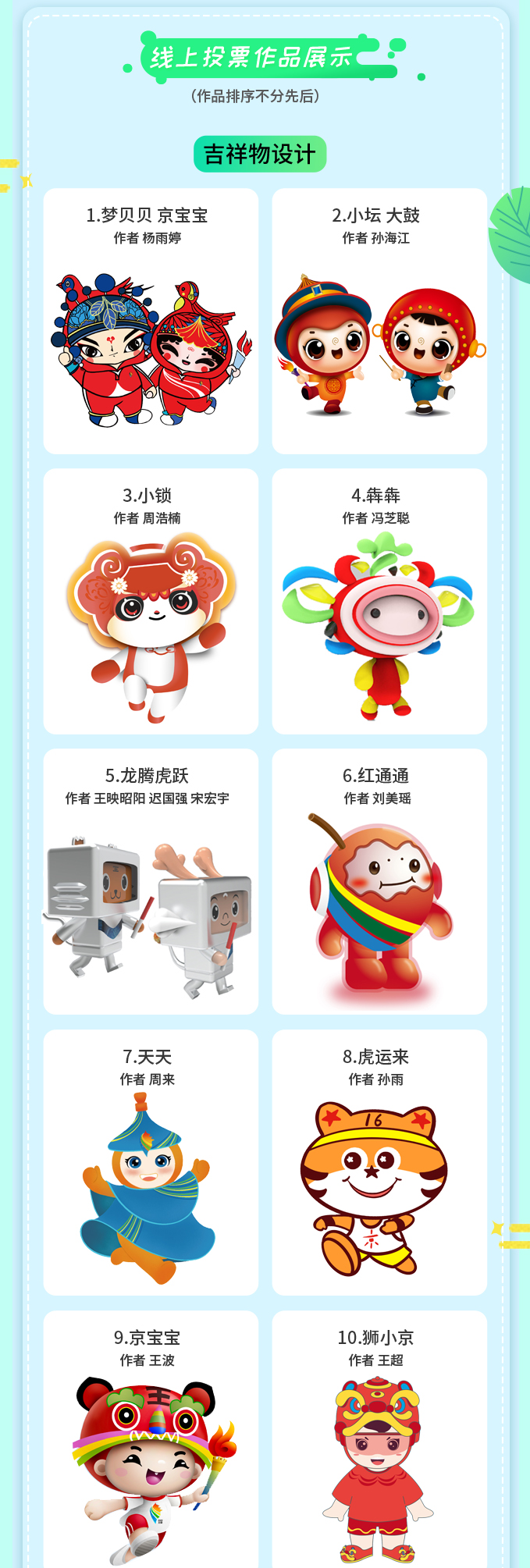 本次征集活动参与范围广泛,应征者涵盖各行各业、老中青少各年龄群体,来自吉林艺术学院的北京冬残奥会吉祥物“雪容融”设计团队师生也积极响应参与其中。经主办方初选,有80个吉祥物作品、100条宣传口号作品入围线上投票阶段。