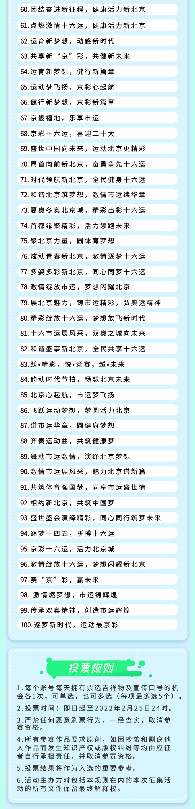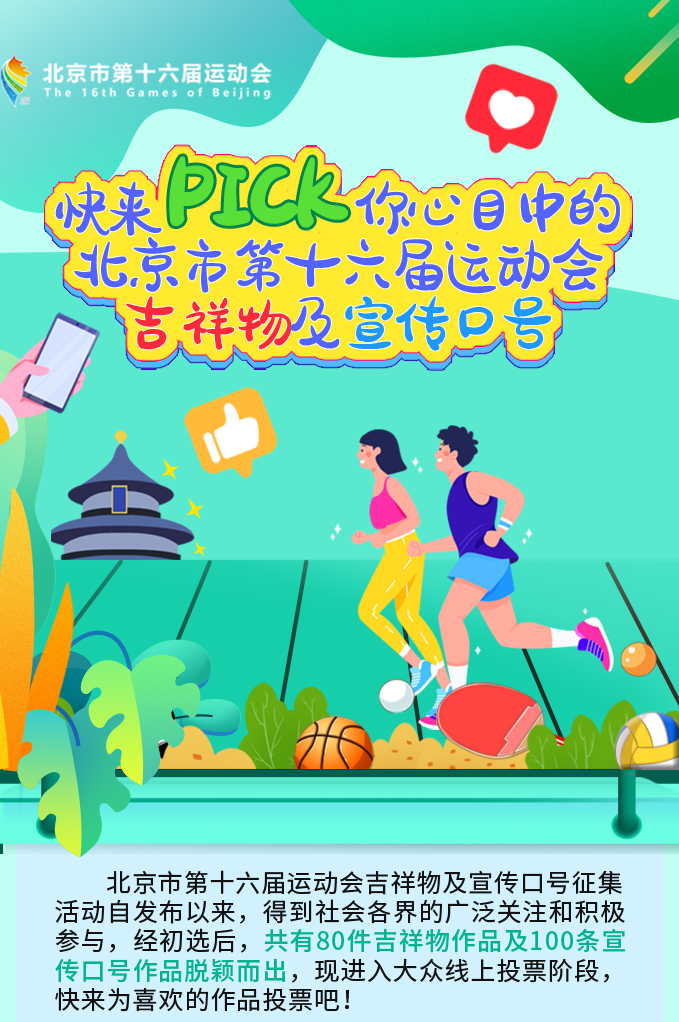 即日起,北京市第十六届运动会吉祥物及宣传口号征集活动大众线上投票开启。投票至2月25日结束,大众可通过登录北京市体育局、北京市体育竞赛管理和国际交流中心官网及官方微信公众号,或关注“体育北京”“北京竞技场”官方微博进入投票通道,了解作品详情,为喜欢的作品投票。