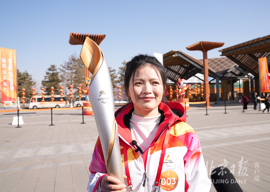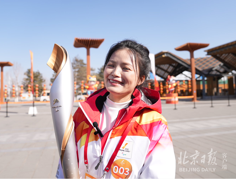 3月3日下午,北京冬残奥火炬传递在世园公园进行。早春时节,天气也逐渐回暖,顶着温暖的阳光,文花枝激动地接过火炬,和煦的春风吹拂她的脸颊,她高举火炬开始了自己的火炬传递。