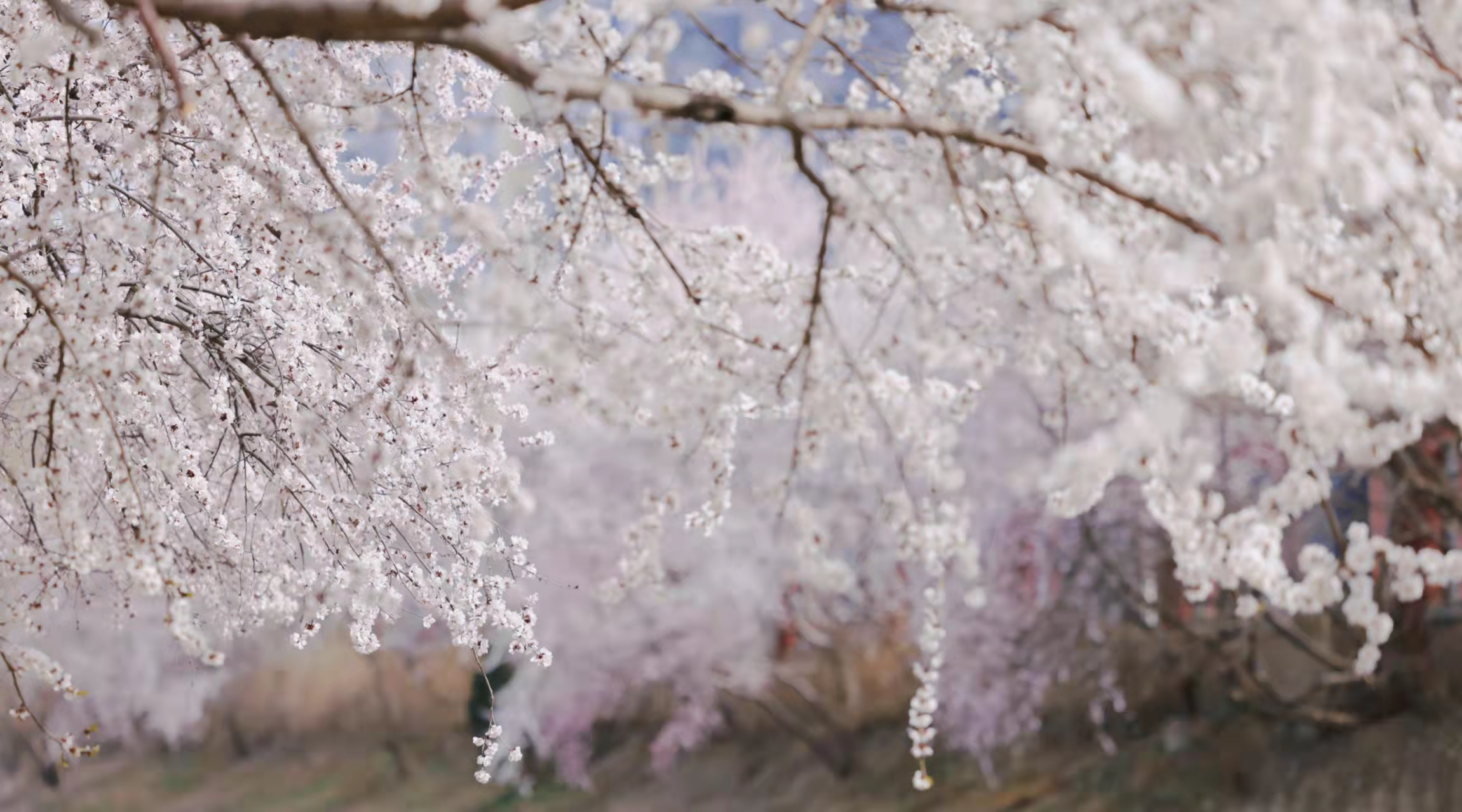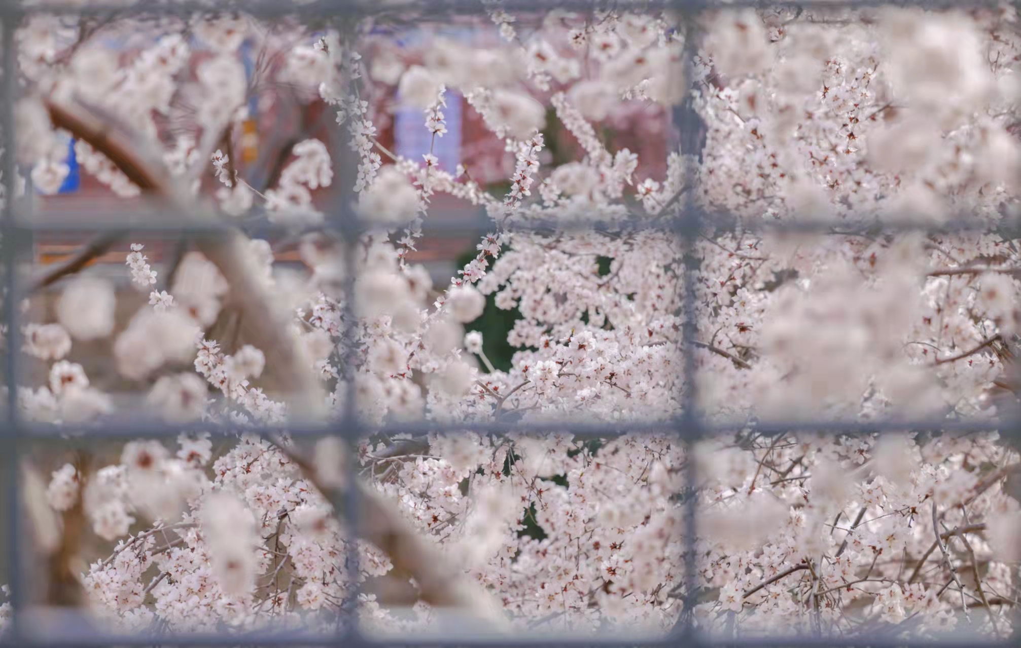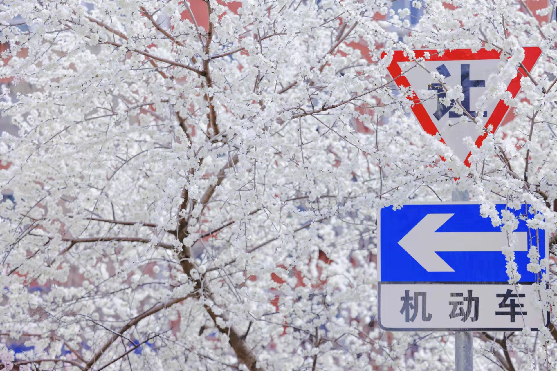 近日,春意渐浓,北京市朝阳区十里堡二道沟畔北岸,几十株山桃花争相盛开,朵朵桃花粉白娇艳,与河沟交织形成一幅闹中取静的春景图,吸引了许多市民前来打卡拍照。