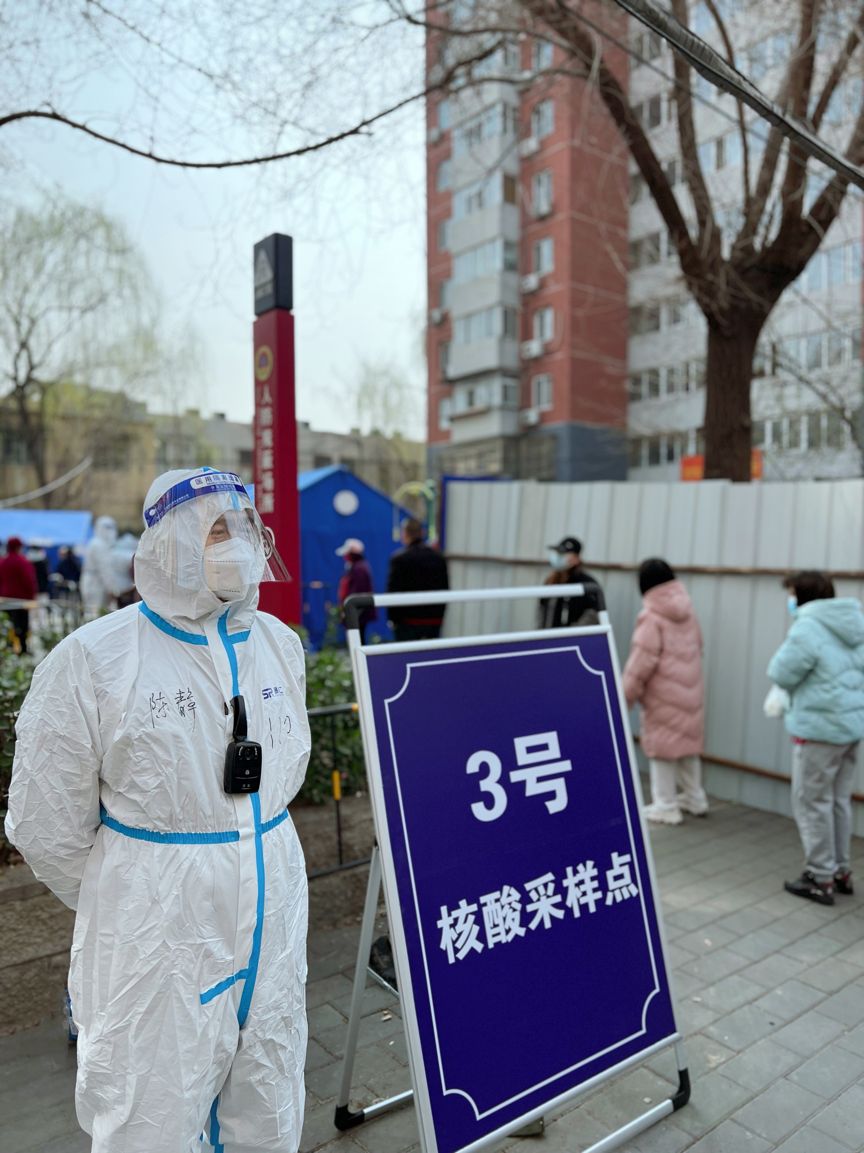 3月21日,八里庄北里东社区也出现了确诊病例,社区警务队队长师鹏迅速穿上防护服,与社区民警兼社区副书记张玉春一起加入到防疫队伍中。根据街道统一安排,他们对小区进行了封控,并协助社区开展起全员核酸检测工作。