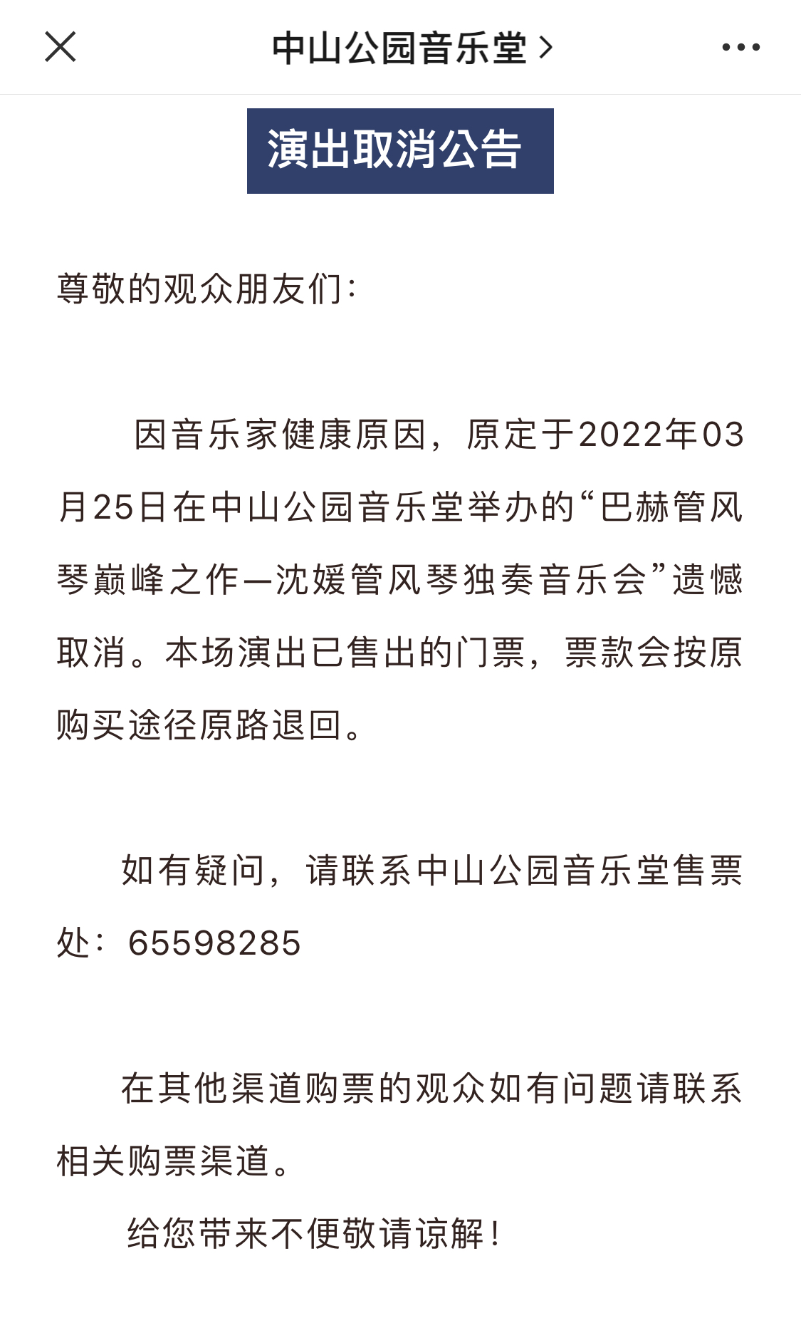 中山公园音乐堂通过微信公众号发布,出于音乐家健康原因和疫情防控需要,原定于2022年3月25日、3月27日举行的“巴赫管风琴巅峰之作—沈媛管风琴独奏音乐会”和“超燃音乐系—英雄史诗交响电声音乐会《权力的游戏》”(A版曲目)取消。