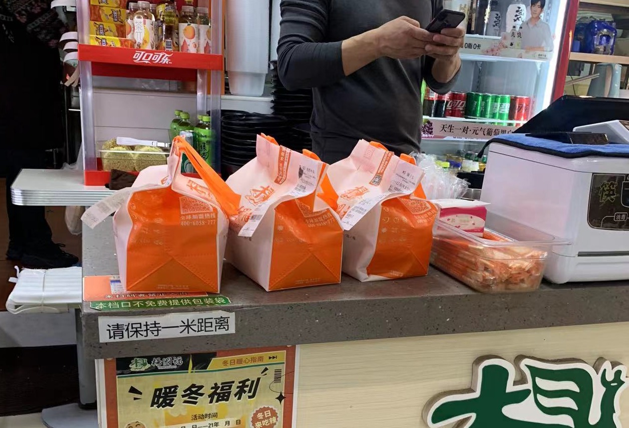 美食广场提供外卖送餐服务的各家店铺,牛哇塞筋头巴脑牛杂煲、杨国福麻辣烫等店铺已采用带提手的纸袋或是小型购物袋作为外卖包装袋,订书钉成了服务员打包的标配。杨铭宇黄焖鸡米饭店铺的柜台内,整齐摆放着成摞的牛皮纸手提袋,服务员将外卖装入袋子后,会立刻在袋子的封口处“咔咔咔”订上3枚订书钉,对外卖进行密封,10余个密封好的外卖袋正在等待快递小哥的到来。