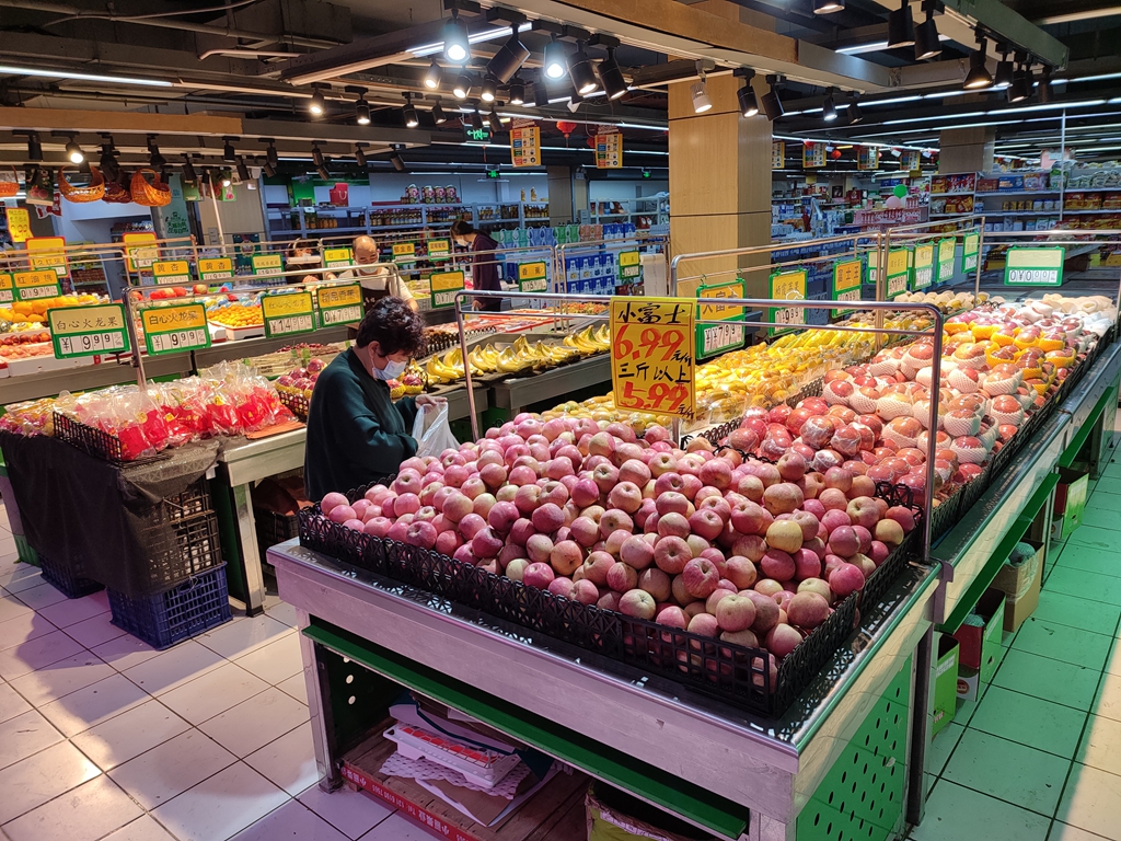晚上七点半,记者来到位于丰台梅市口路的家家福超市。一进门是饮料区,各种饮料、牛奶摆满了货架。再往里走的包装食品区、米面油区、水果区,货品同样十分充足。这个时间点,在超市购物的人并不多。结账区也并不需要排队。