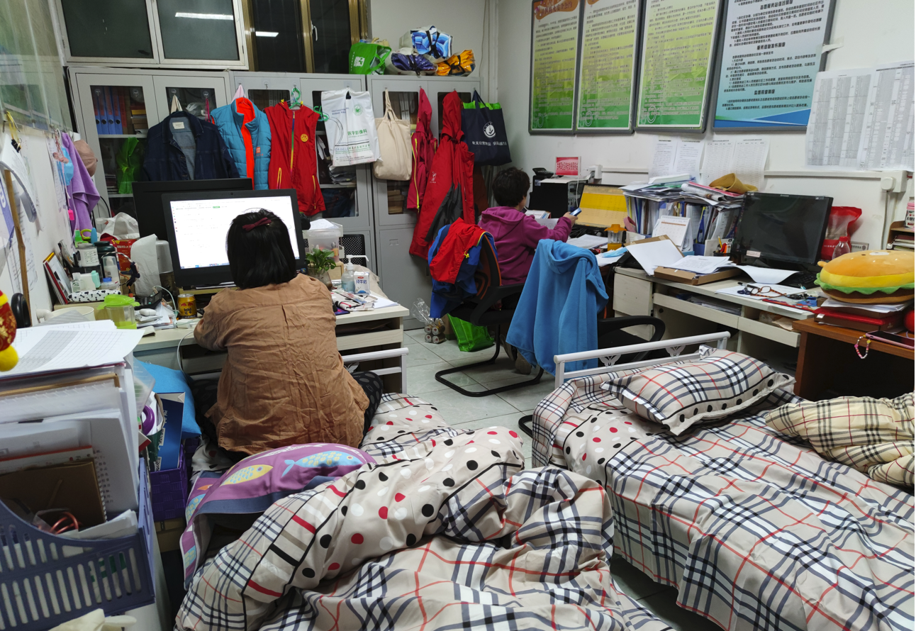 高艳辉的办公室角落,摆放着一张简易床。从4月23日起,她就住在了单位。“住到5月5日,我家被封控了,彻底断了‘念想’。”爱人居家,读大学的儿子住校,20多天来,一家三口分居三地,只能靠微信偶尔互报平安。