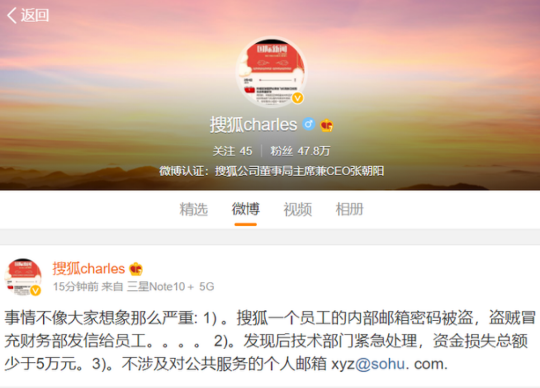 随后不久,搜狐也通过官方微博发布了一份声明。声明中称,该事件经调查,实为某员工使用邮件时被意外钓鱼导致密码泄露,进而被冒充财务部盗发邮件。据统计共有24名员工被骗取四万余元人民币。