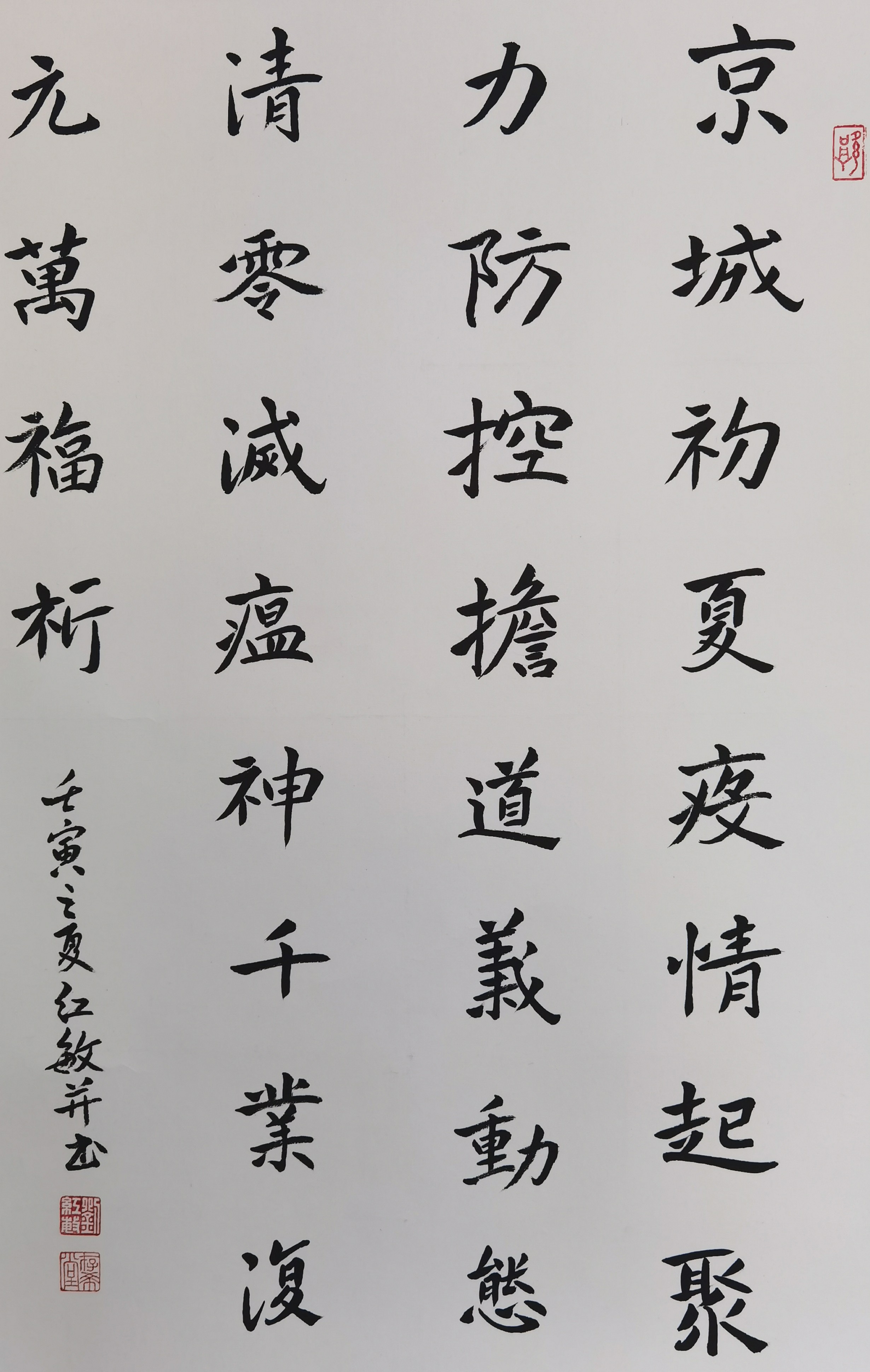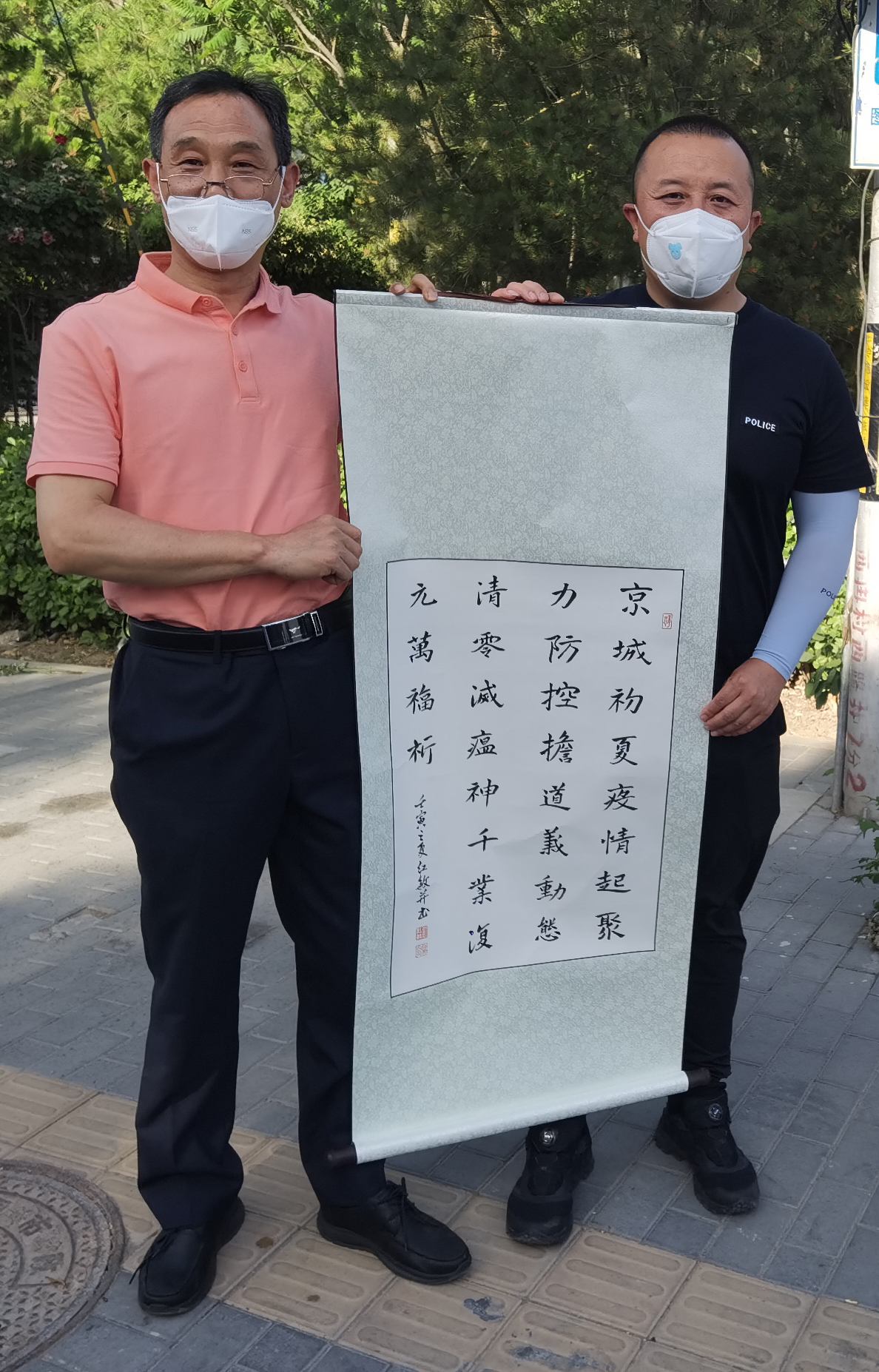 “京城初夏疫情起,聚力防控担道义,动态清零灭瘟神,千业复元万福祉。”端午节来临,海淀四季青镇西冉地区居民创作一幅书法作品,表达对连日来值守在疫情防控一线的民警的感谢。四季青派出所民警们从中感受到辖区居民的温暖情意,更加坚定了警民同心战胜疫情的信念。