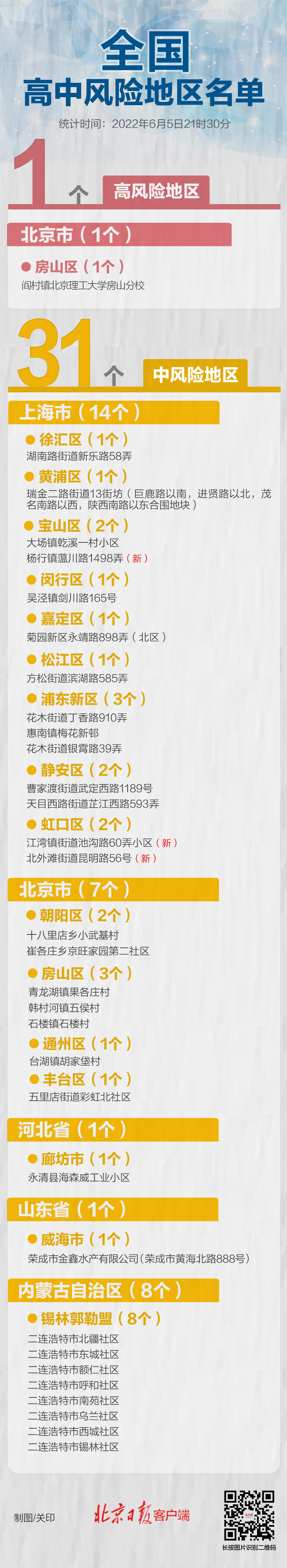 6月5日,上海市新冠肺炎疫情防控新闻发布会通报,根据上海市目前疫情形势和相关规定,经上海市新冠肺炎疫情防控工作领导小组办公室研究决定,将宝山区杨行镇蕰川路1498弄、虹口区江湾镇街道池沟路60弄小区、虹口区北外滩街道昆明路56号列为中风险地区,上海市其他区域风险等级不变。