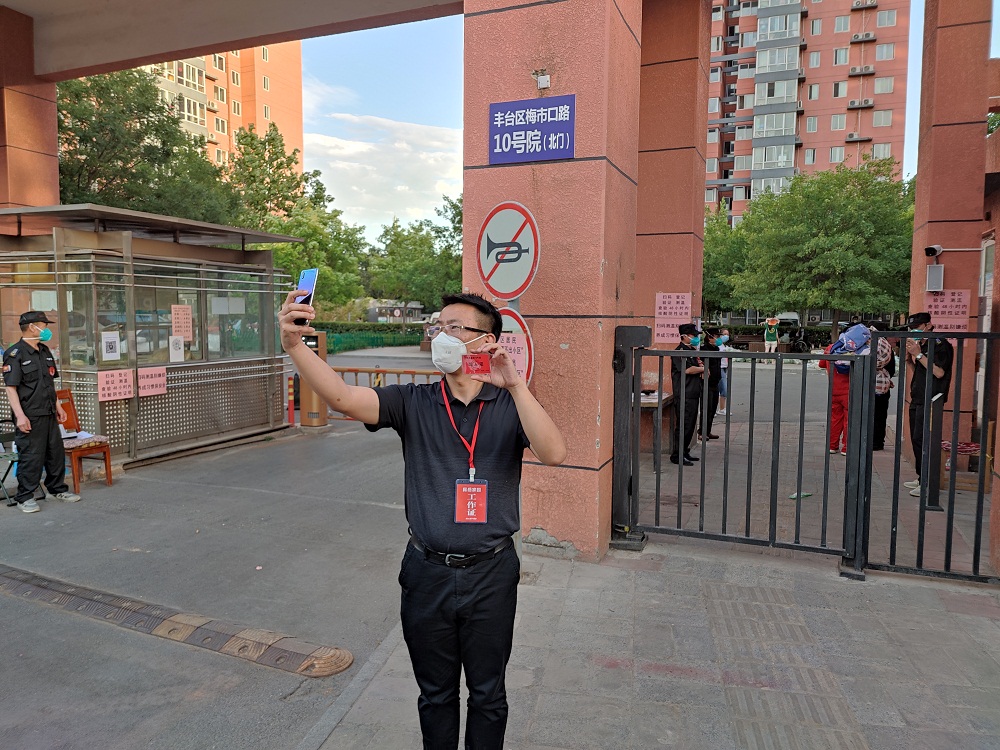 在小区门口拍纪念照的居民不少,其中一个人还戴着特别的“抗疫工作证”。一问才知,他是小区物业上级单位、北京市民政工业总公司规划发展部的主任杨英政。为了给处于封控中的民岳家园东区和西区提供服务保障,总公司动员了近300名员工组成保障团队。杨英政的家就住在民岳家园东区,自家小区需要人手支援,他自然义不容辞冲了上去。