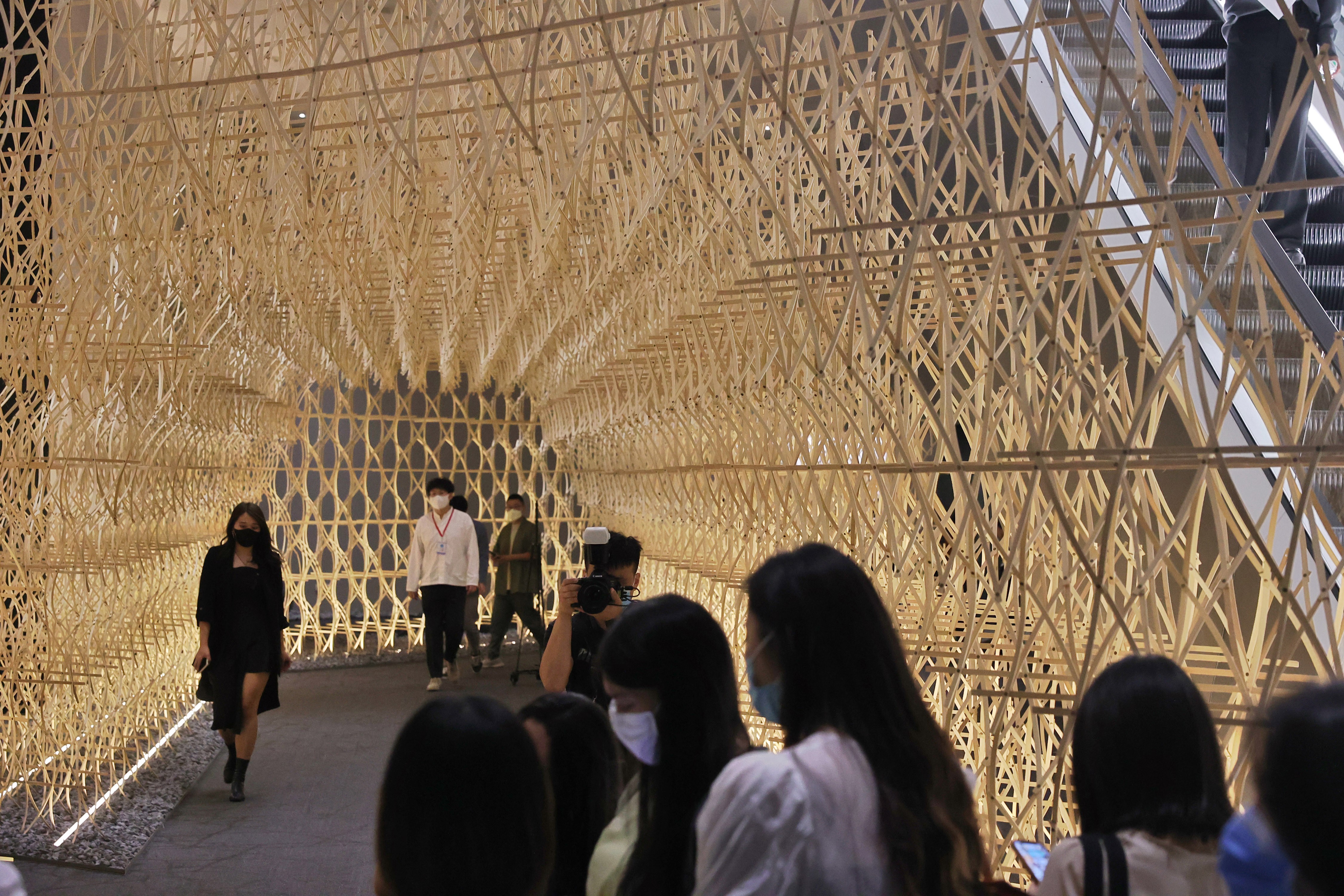 国际著名建筑设计师隈研吾的最大规模体验式展览《五感的建筑》也同期开启。展厅入口处的大型装置《竹涧》由一万支以上竹条构成,用可再生、可重复组装的构件所连接,展现出隈研吾关于“自然的建筑”的哲学与生态环保的思想。竹的柔韧与重力形成巧妙平衡,观众可以进入其中感受隈研吾建筑中对于点、线、面的处理,体味建筑如何向着自然延伸。