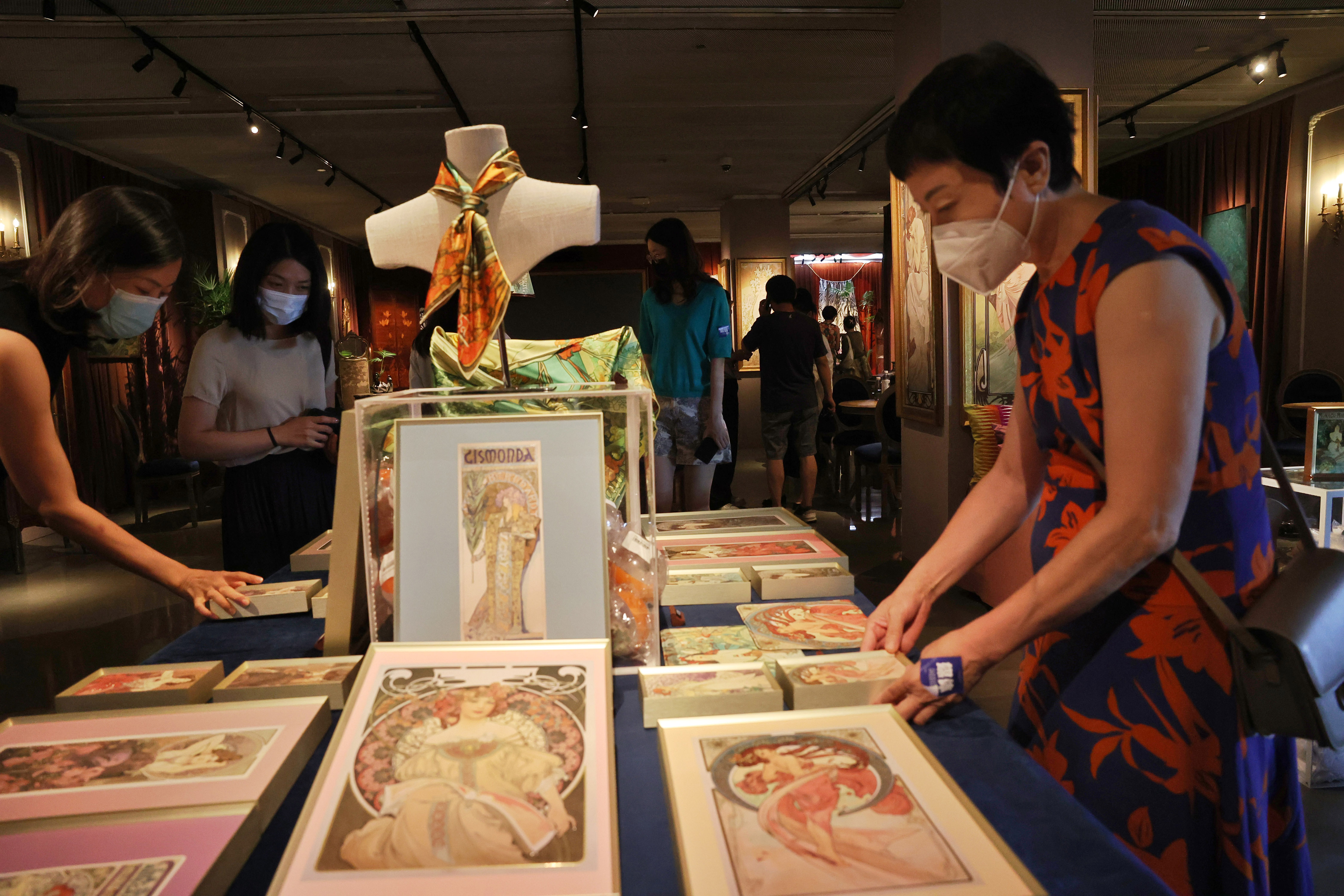 展览的第一展区主要呈现了慕夏本人所珍藏的书籍、艺术品及工艺品,探究影响“慕夏风格”的重要元素。其中有19世纪的中国绣花挂毯、传统捷克玻璃画、日本浮世绘等。慕夏把这些东西放在工作室,仔细观察它们,有时会画出草图,作为灵感的来源。