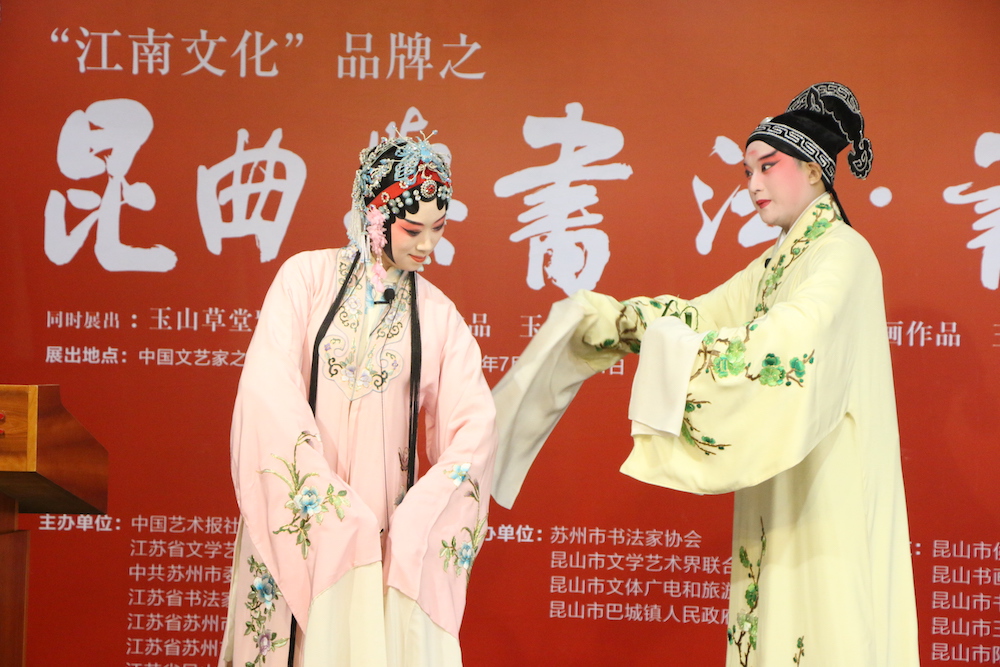 7月26日,昆曲与书法·书法展在中国文艺家之家展览馆开幕。展览分为“玉出昆冈——历代名人咏昆山”“玉山雅集·诗联作品”“昆曲与书法”三个部分,共展出霍国强等著名书画家创作的作品近200幅,展现昆山之美、昆曲之美、传统之美。