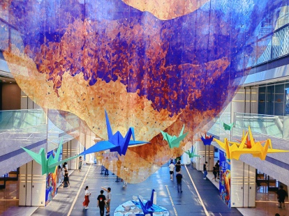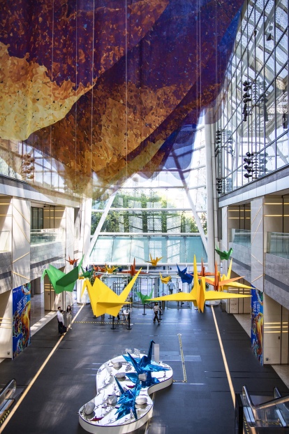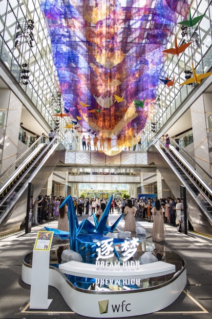 环球金融中心的首层中庭,百余只彩色纸鹤从空中垂下。伴随着音乐的流动,现场嘉宾和写字楼员工共绘巨型艺术影像作品。此次艺术影像展通过对色彩的解读和运用,打造斑斓色彩与绚丽光影结合的美好场域,表达对个体和梦想的关注。