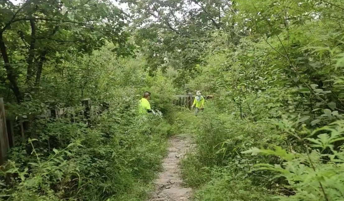 为恢复古道的宽敞美观,志愿者们分工协作,有的弓着身子,用镰刀割掉路边的荆棘、灌木;有的用除草机清理两侧的杂草;走在队伍后面的负责徒手将垃圾一捧捧装进麻袋。