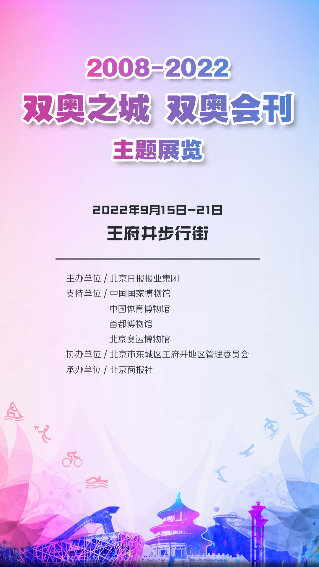 9月15日至21日,北京日报报业集团主办的“2008—2022双奥之城 双奥会刊”主题展亮相北京王府井步行街。展览分为双奥之城、双奥之赛、双奥之人、双奥会刊四大版块,总展览面积700平方米。观众可通过长约百米的“卷轴”式参观路线,沉浸式回顾双奥记忆,感受新时代首都发展的生动实践。