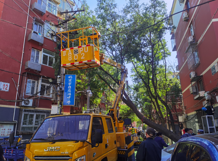 园林、电力部门及时赶到查看情况后,12时30分许,园林工人登上高架车开始用电锯从上到下处理树枝,然后将树干截成几段,用绳子捆绑后,再用高架车上的钩子将其一段段运到地上。与此同时,电力工人也开始高空作业,及时抢修受损的线路。