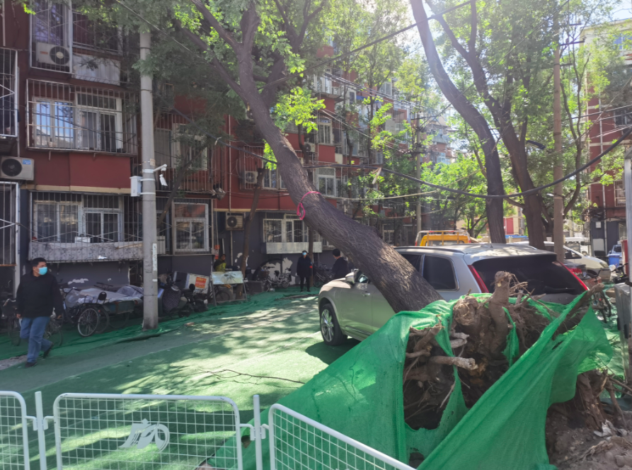 只见右内西街甲10号院11号楼东侧,一棵5层楼高、直径约50厘米的国槐树几乎被大风连根拔起,被刮倒的树干压在了半空的高压电线上,部分树枝还插入了对面12号楼4层一户人家的阳台。“多亏电线还把树挡了一下,这下才没砸到树下停的车,也没砸到行人。”一位院内居民说。
