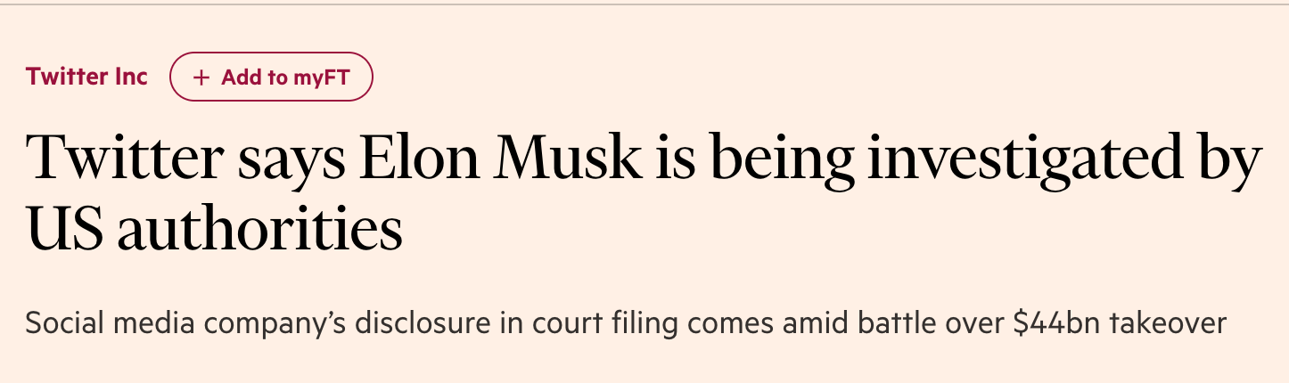 英国《金融时报》14日援引社交媒体公司推特的法庭文件报道称,特斯拉首席执行官马斯克正因“与收购该社交媒体集团有关的行为”而接受联邦政府的调查。