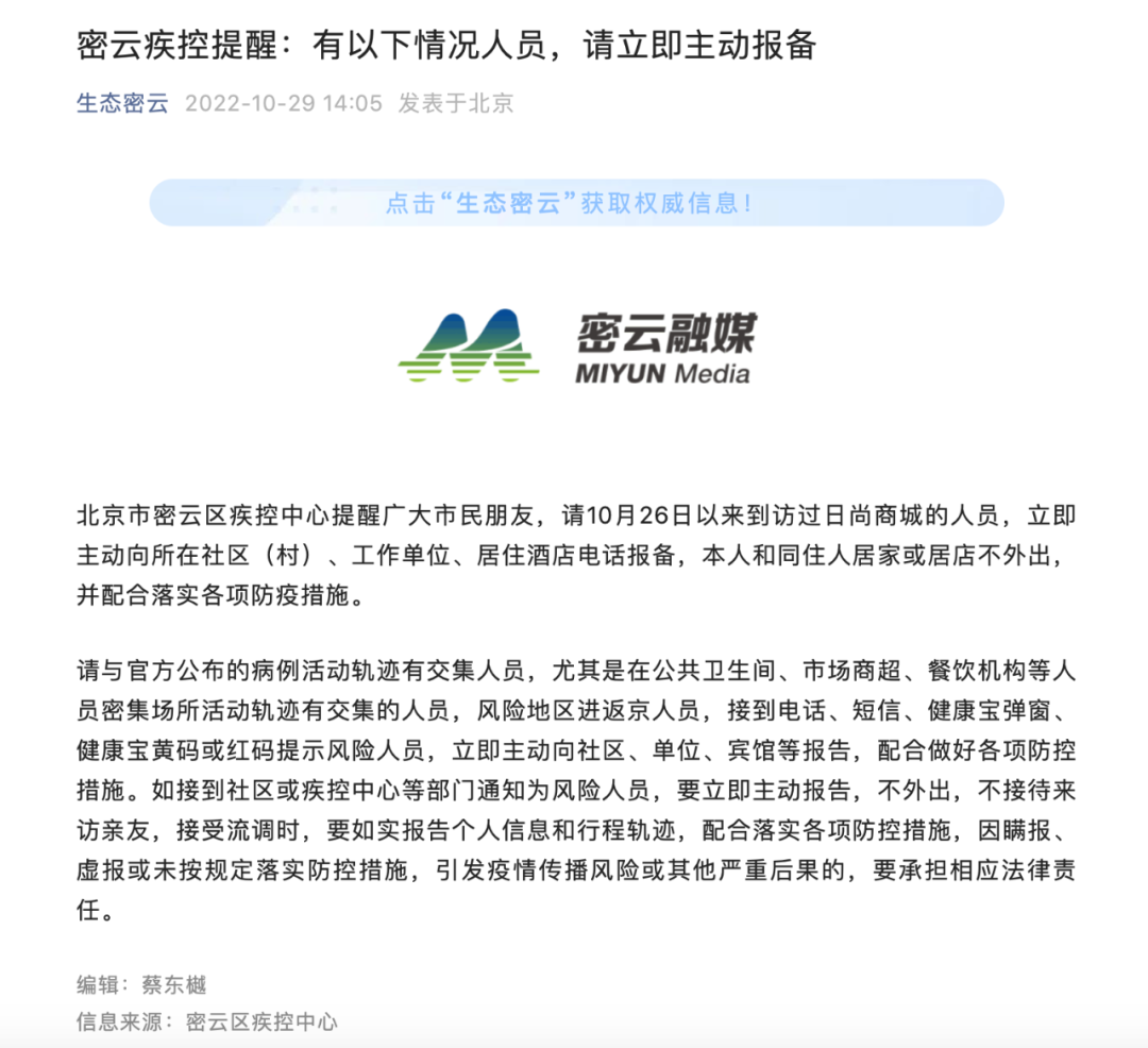 北京市密云区疾控中心提醒广大市民朋友,请10月26日以来到访过日尚商城的人员,立即主动向所在社区(村)、工作单位、居住酒店电话报备,本人和同住人居家或居店不外出,并配合落实各项防疫措施。